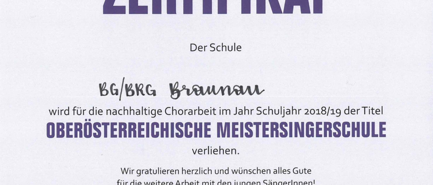 Für vorbildliche und qualitätsvolle Chorarbeit wurde 78 oberösterreichischen Schulen aus den Bereichen VS, NMS, AHS und BMHS das Gütesiegel „OÖ. Meistersingerschule“ verliehen, unter ihnen auch dem BG und BRG Braunau am Inn.