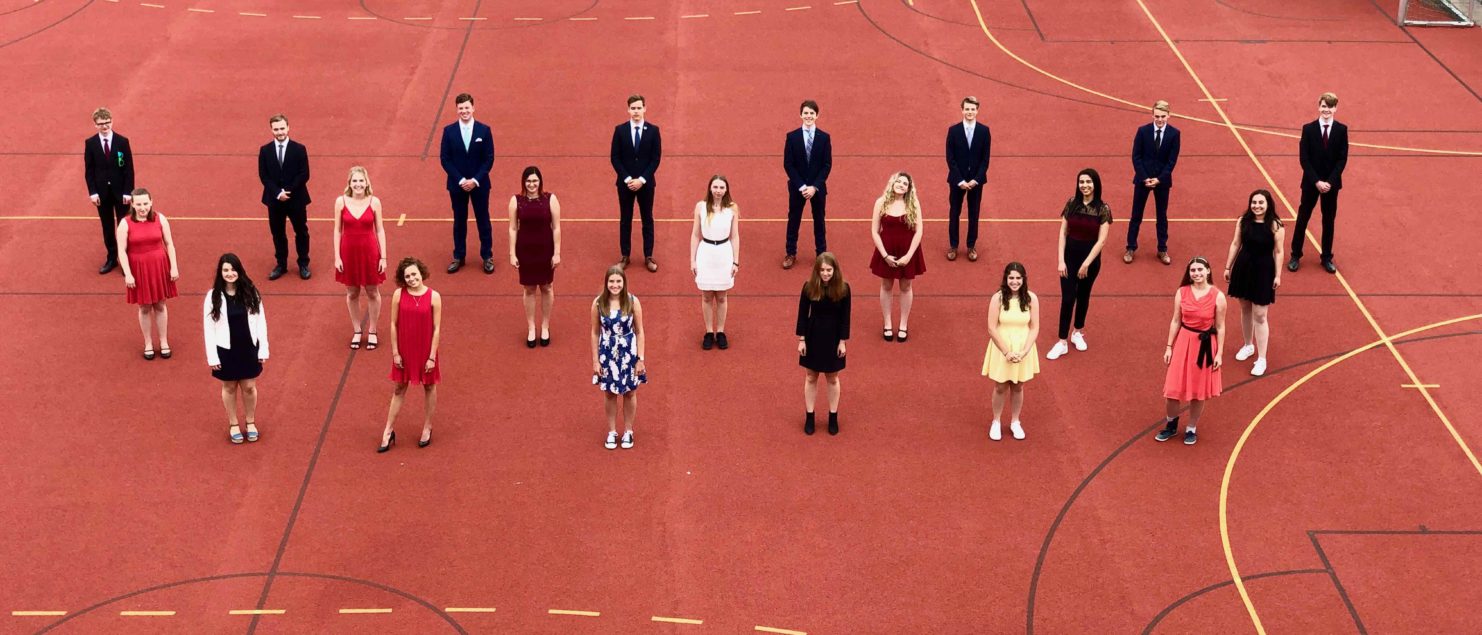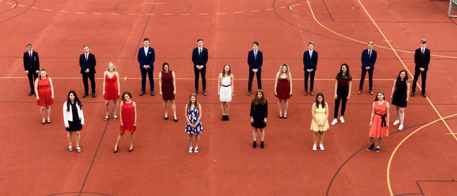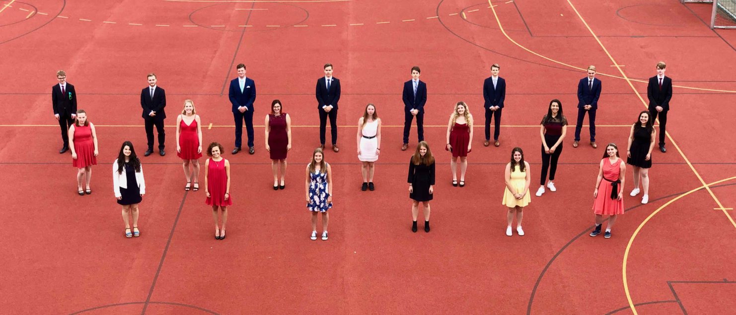 Zum Abschied von ihrem Status als Schüler/innen posierten die angehenden Maturantinnen und Maturanten – den Umständen entsprechend – noch für ein „Abstandsfoto“ auf dem Sportplatz. Aber auch die Hoffnung auf ein richtiges Maturafoto, so es die geltenden Bestimmungen zulassen, wurde noch nicht aufgegeben …