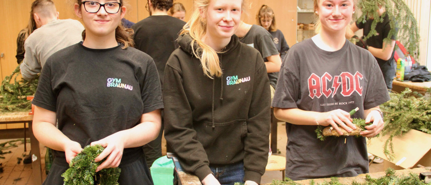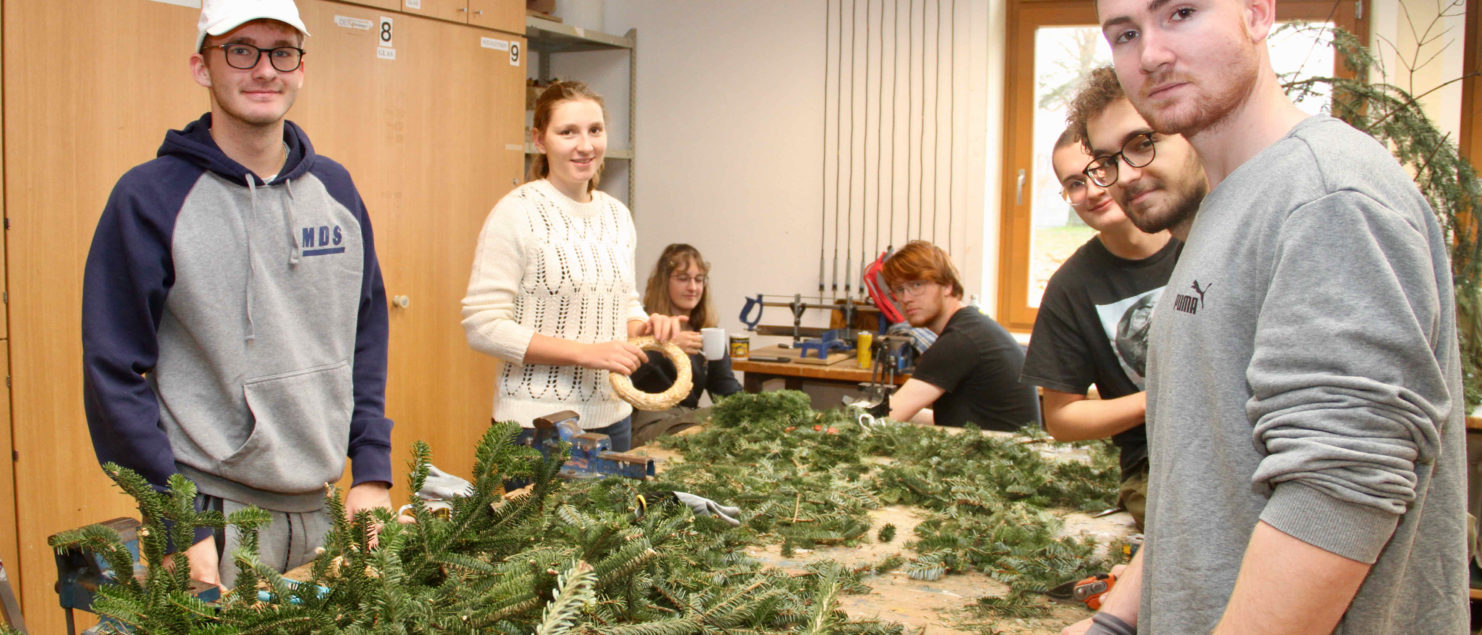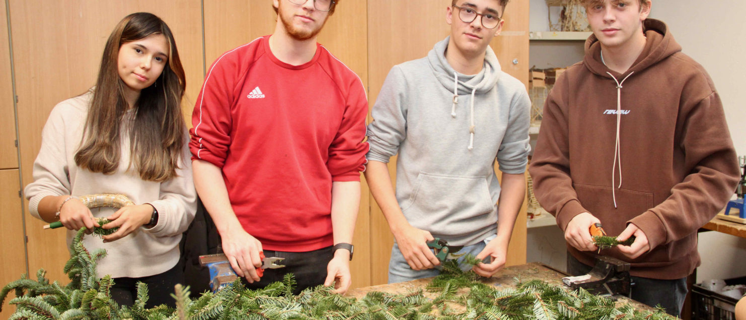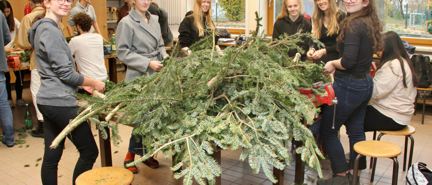 Am vergangenen Wochenende war es so weit: Die Schüler*innen der achten Klassen kamen in der Schule zusammen und banden 120 Adventkränze. Die notwendigen Fertigkeiten hatten sie sich einige Tage zuvor in einem zweitstündigen Kurs beibringen lassen (s. diesbezüglichen Beitrag vom 10. November).