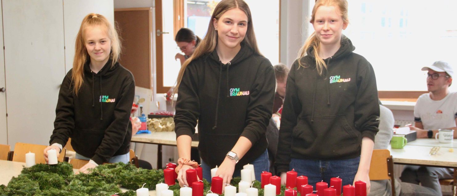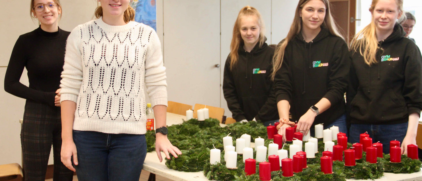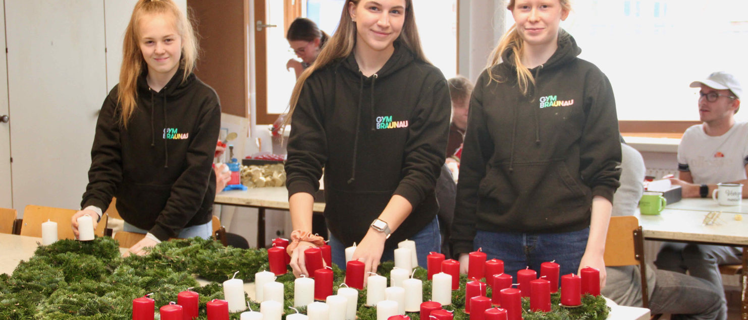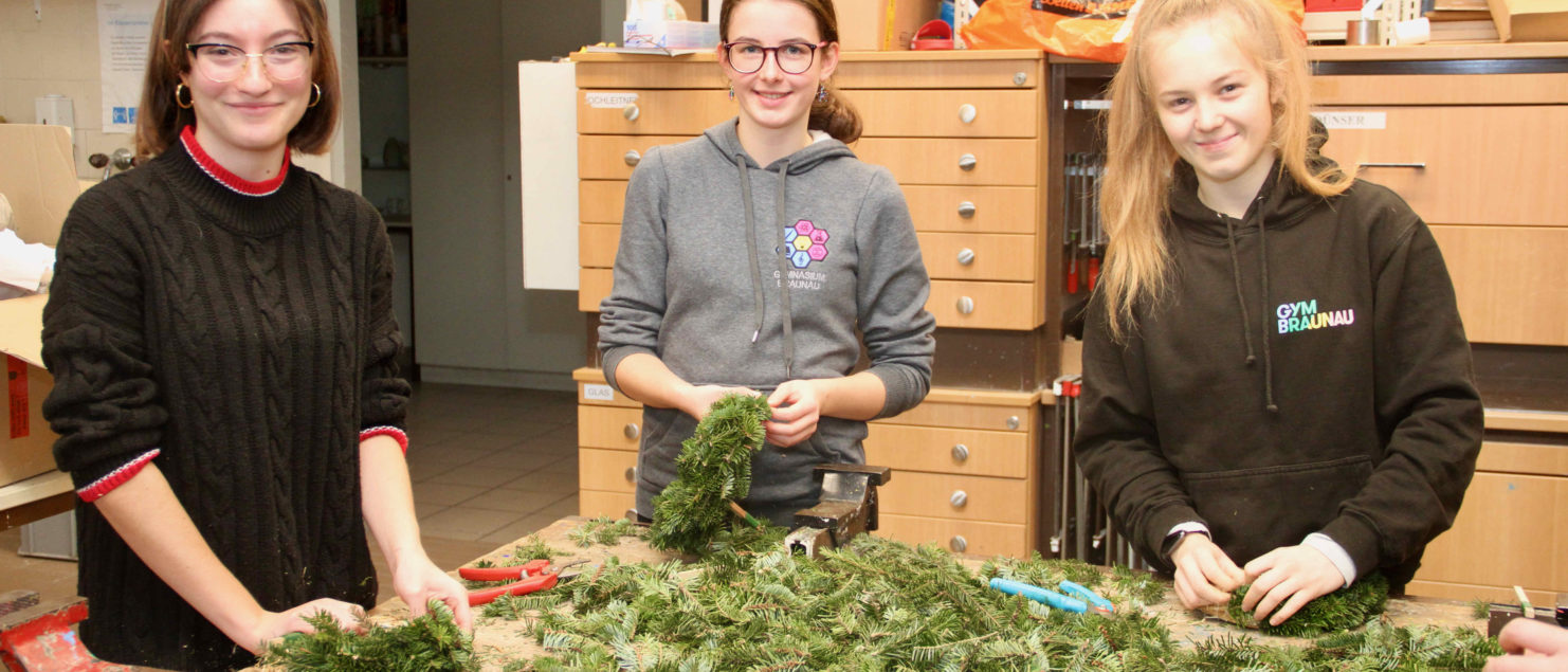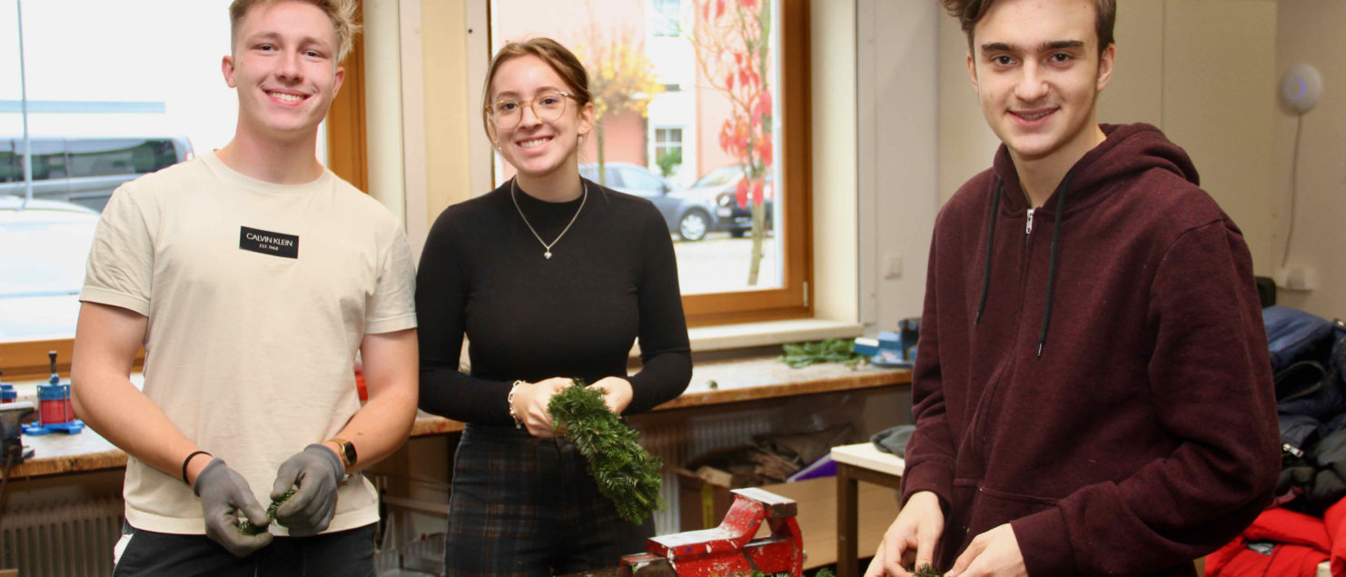 Am vergangenen Wochenende war es so weit: Die Schüler*innen der achten Klassen kamen in der Schule zusammen und banden 120 Adventkränze. Die notwendigen Fertigkeiten hatten sie sich einige Tage zuvor in einem zweitstündigen Kurs beibringen lassen (s. diesbezüglichen Beitrag vom 10. November).