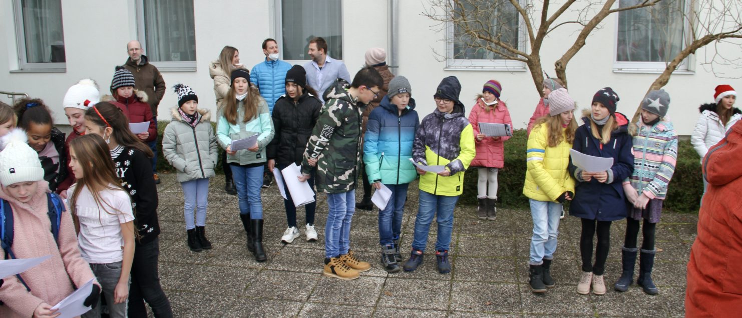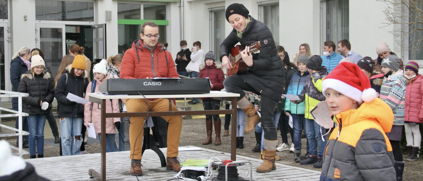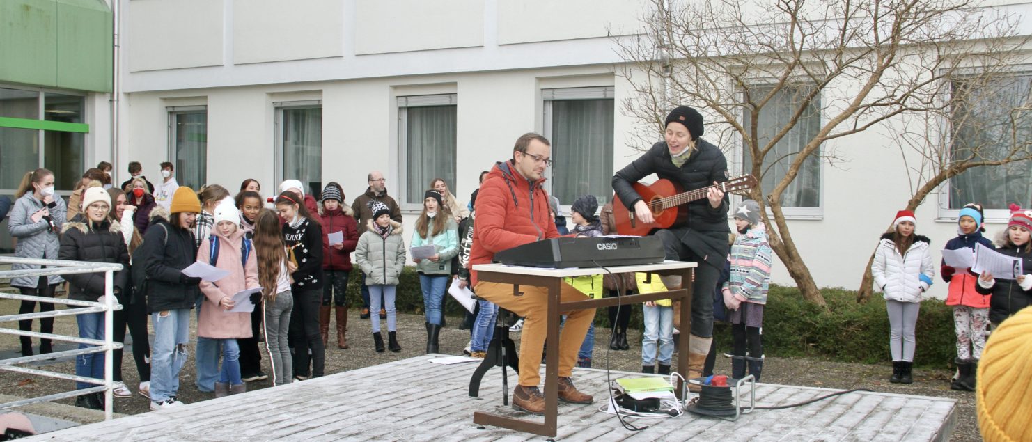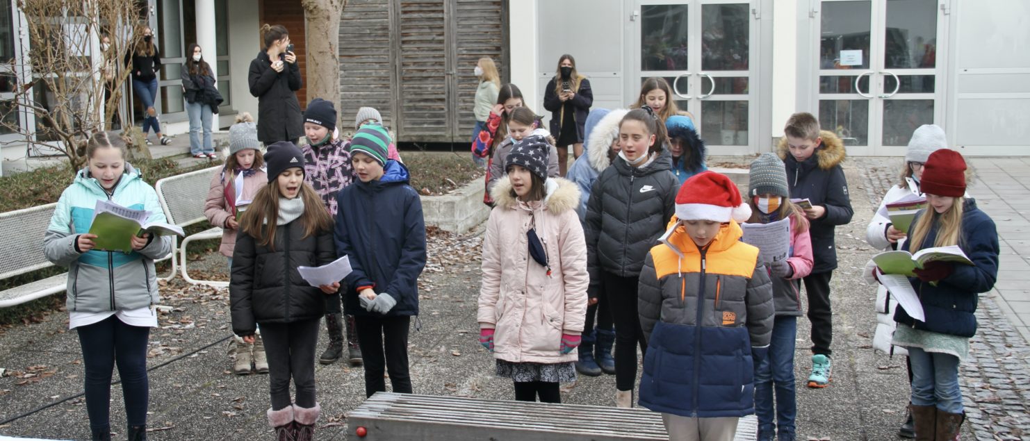 Eine für viele überraschende musikalische Darbietung gab es in der großen Pause am 23. Dezember: Die Schülerinnen und Schüler der ersten Klassen sangen unter der fachkundigen Leitung ihrer Musiklehrerin Daniela Spitzer bzw. ihres Musiklehrers Matthias Kritzinger mit spürbarer Begeisterung bekannte Weihnachtslieder – der Krisensituation entsprechend im Freien.