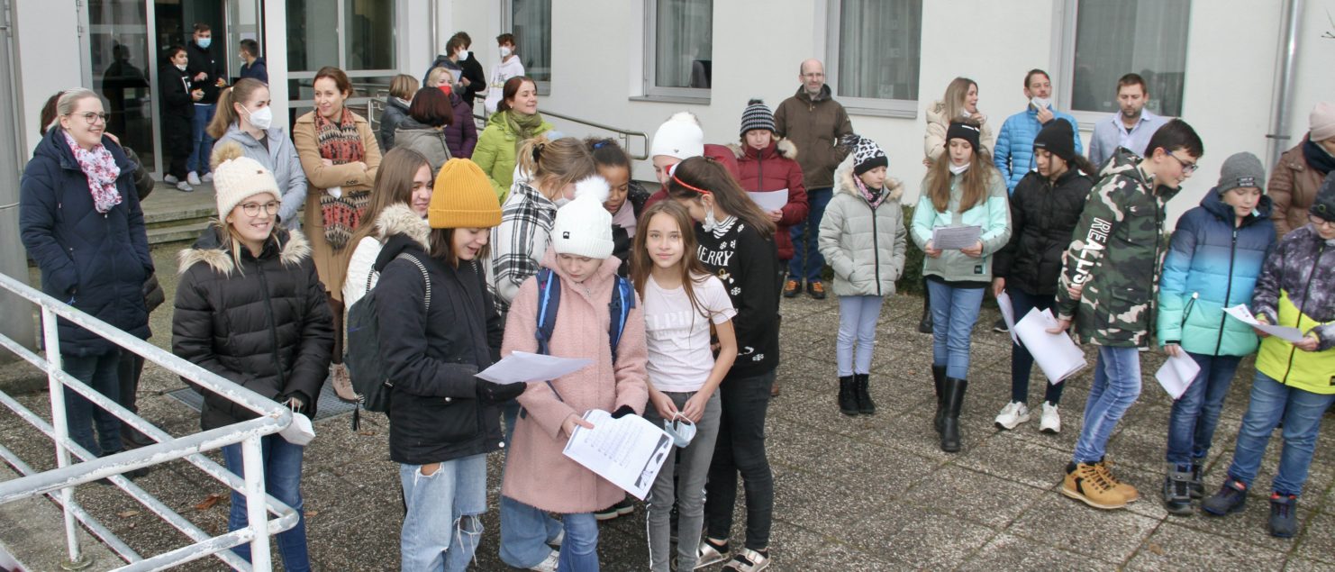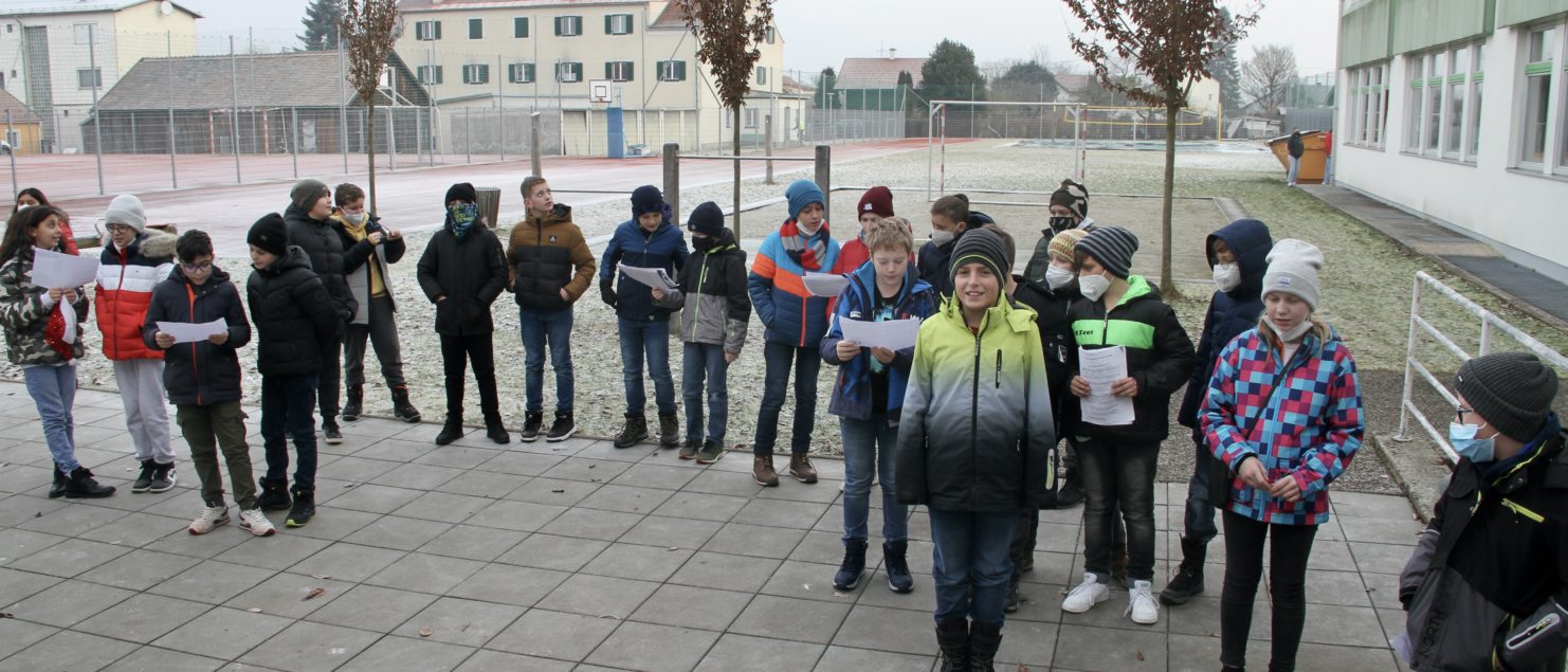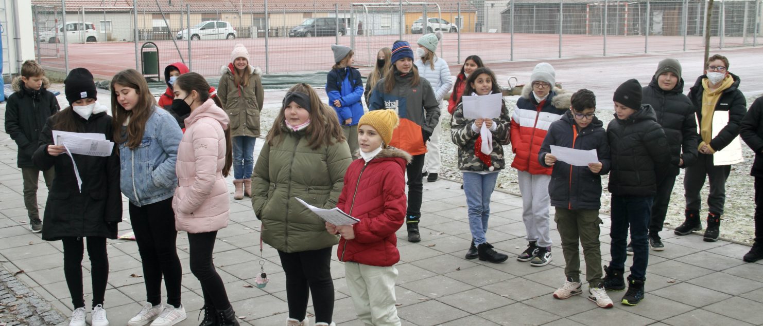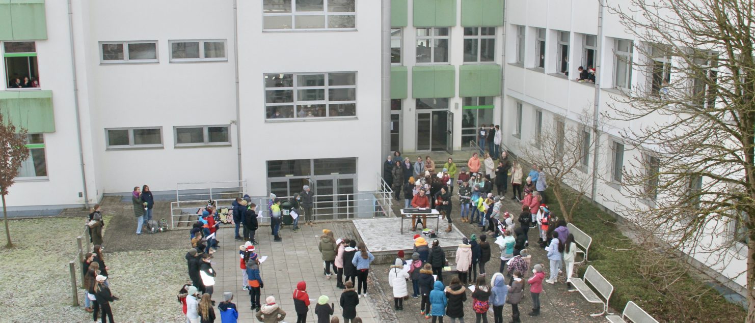 Eine für viele überraschende musikalische Darbietung gab es in der großen Pause am 23. Dezember: Die Schülerinnen und Schüler der ersten Klassen sangen unter der fachkundigen Leitung ihrer Musiklehrerin Daniela Spitzer bzw. ihres Musiklehrers Matthias Kritzinger mit spürbarer Begeisterung bekannte Weihnachtslieder – der Krisensituation entsprechend im Freien.