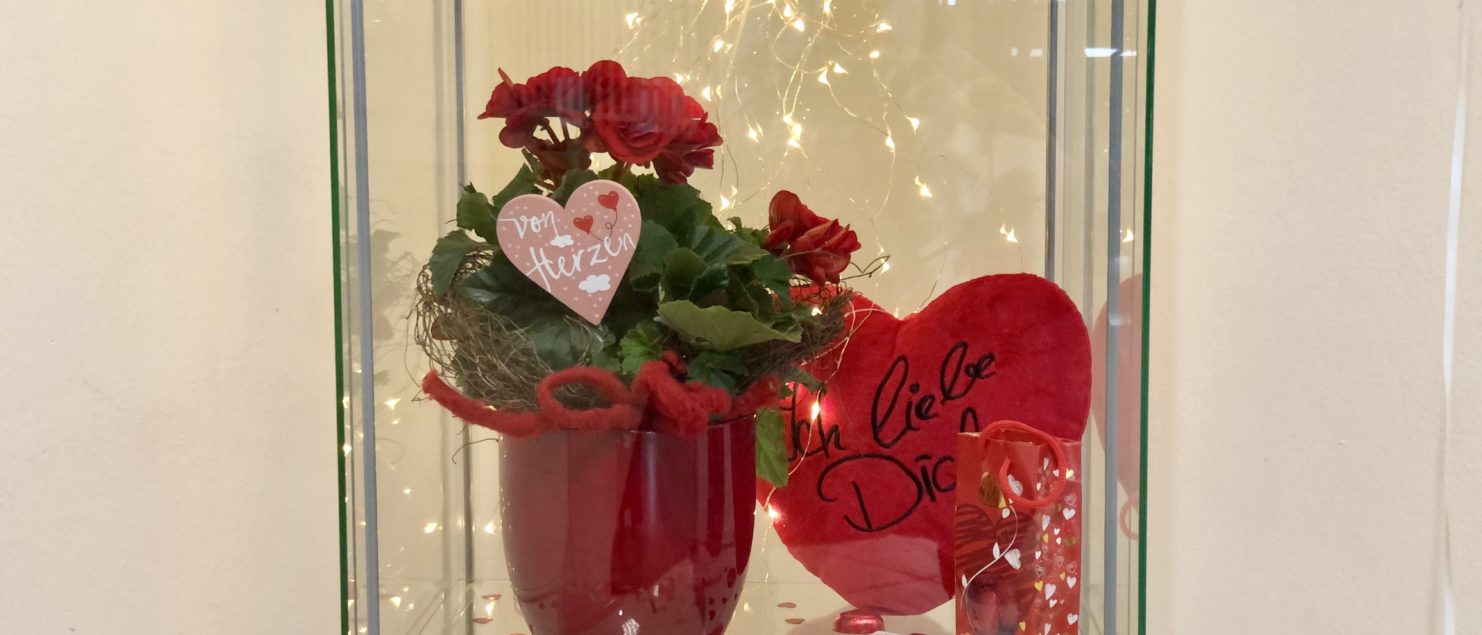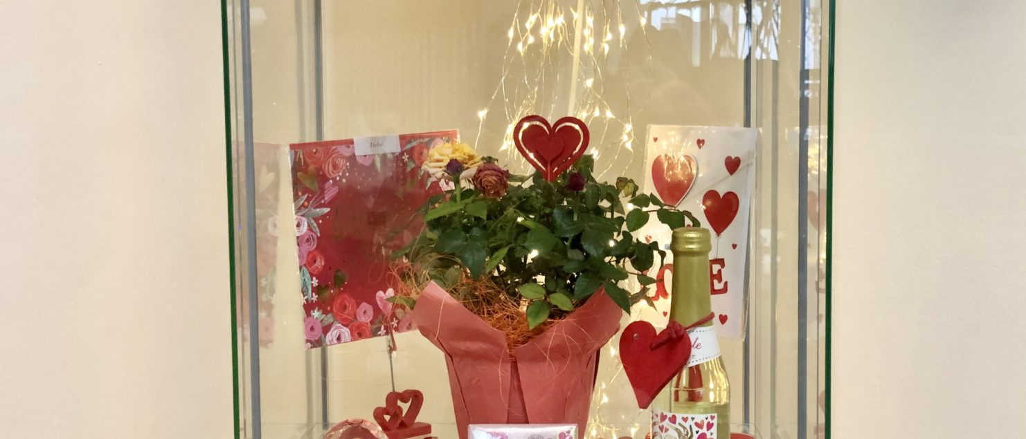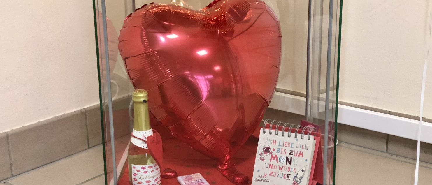 Nach einem Jahr Pause – voriges Jahr fiel der Valentinstag in die vorverlegten Semesterferien – wurde die Vitrine im Erdgeschoß zum heurigen Valentinstag wieder anlassgerecht dekoriert.