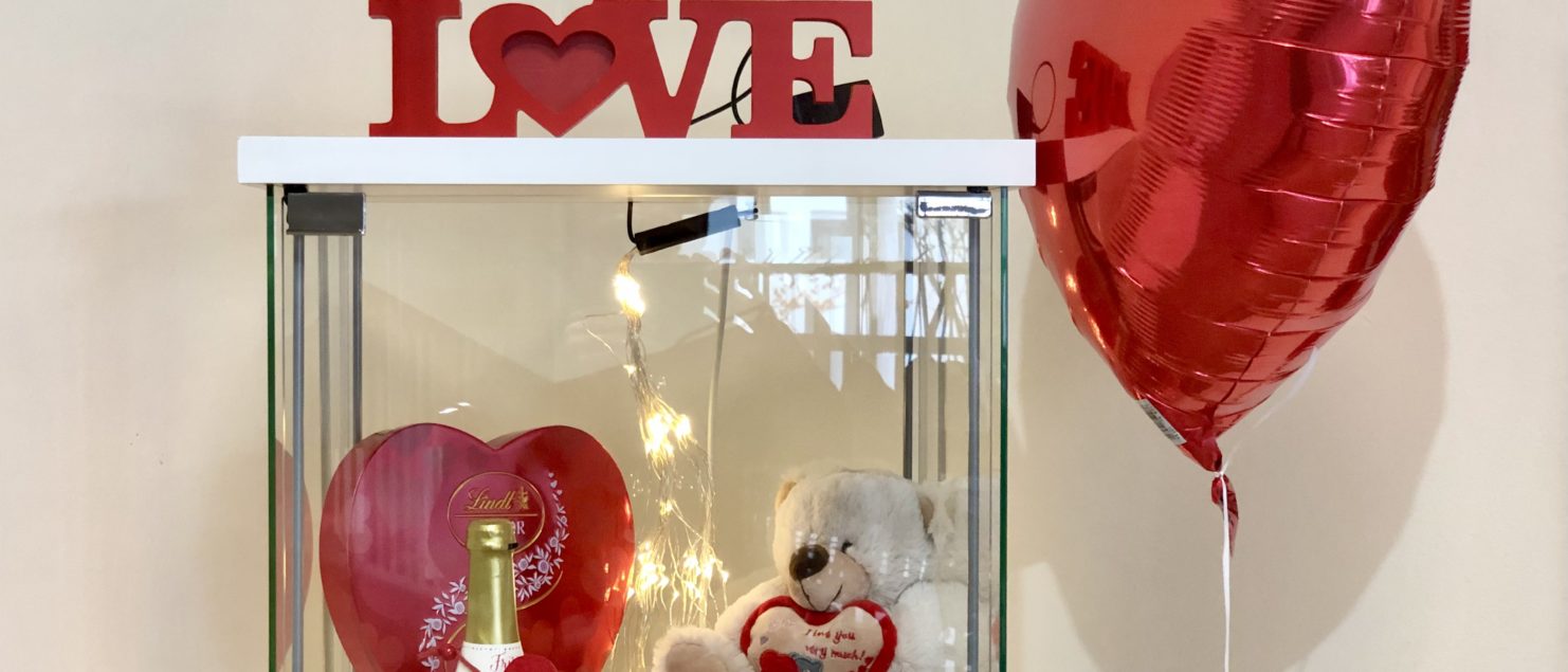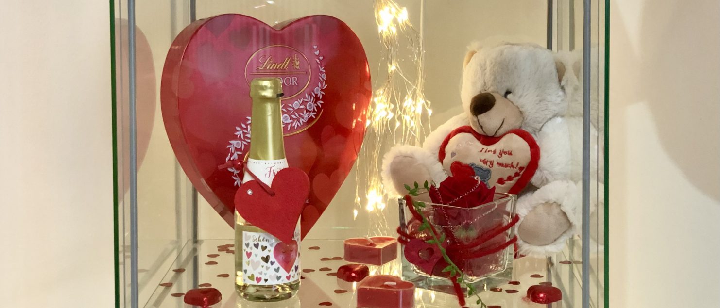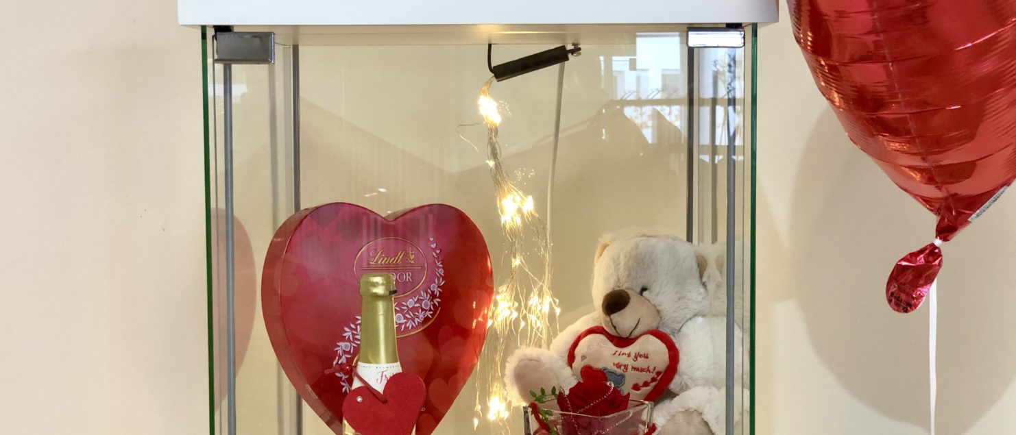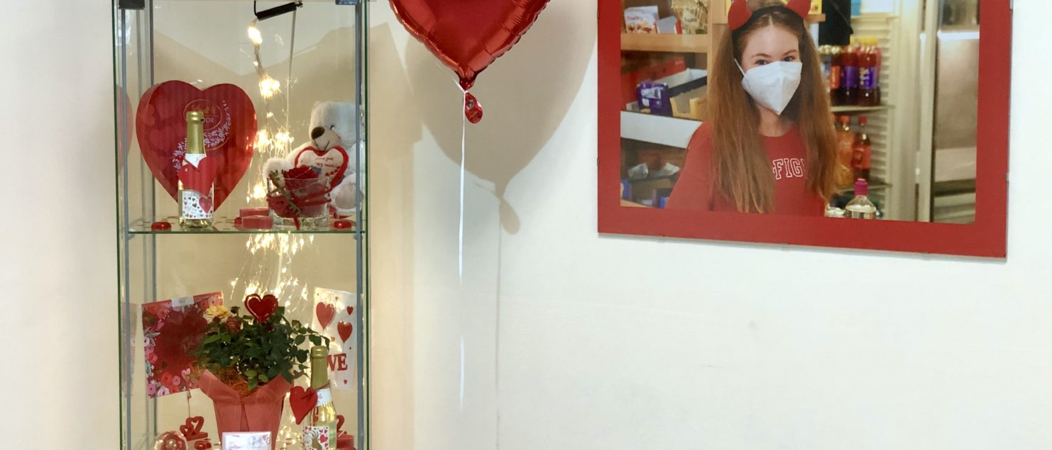 Nach einem Jahr Pause – voriges Jahr fiel der Valentinstag in die vorverlegten Semesterferien – wurde die Vitrine im Erdgeschoß zum heurigen Valentinstag wieder anlassgerecht dekoriert.