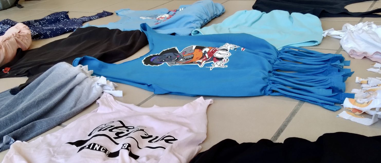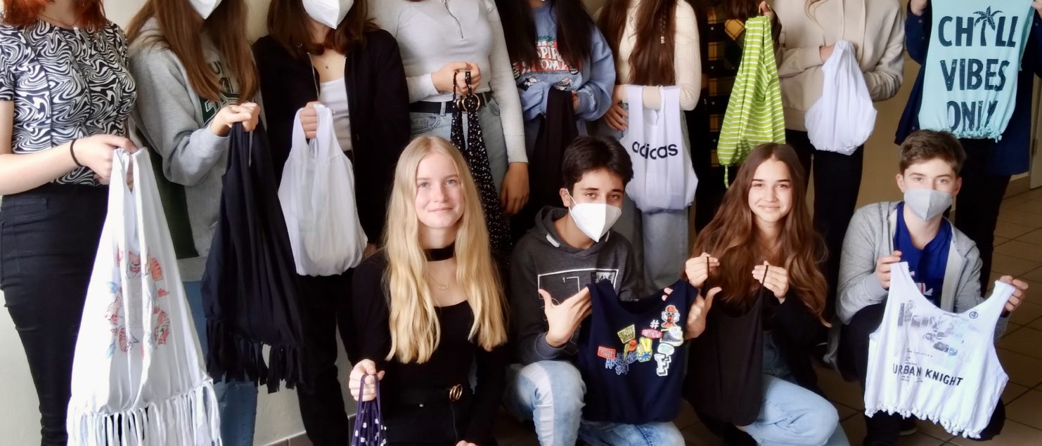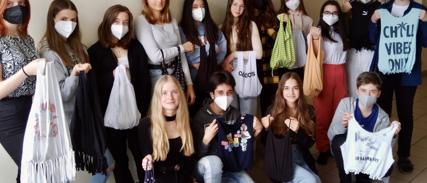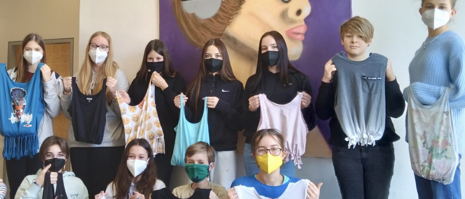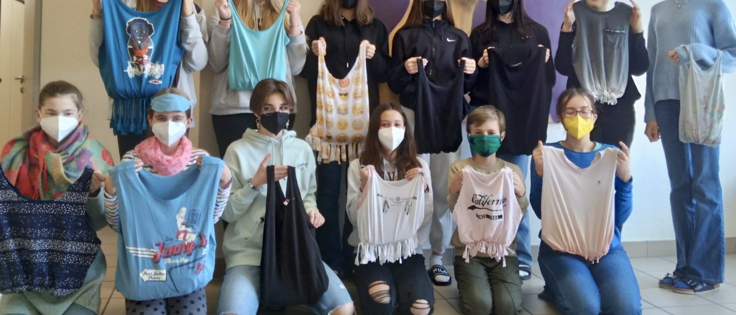 Die Schüler/innen nahmen von zuhause alte T-Shirts mit, welche anschließend mittels Schere und einer Knüpftechnik in Tragetaschen verwandelt wurden. Egal ob zum Einkauf oder als Turnsackerl – die Taschen sind auf alle Fälle ein Hit.