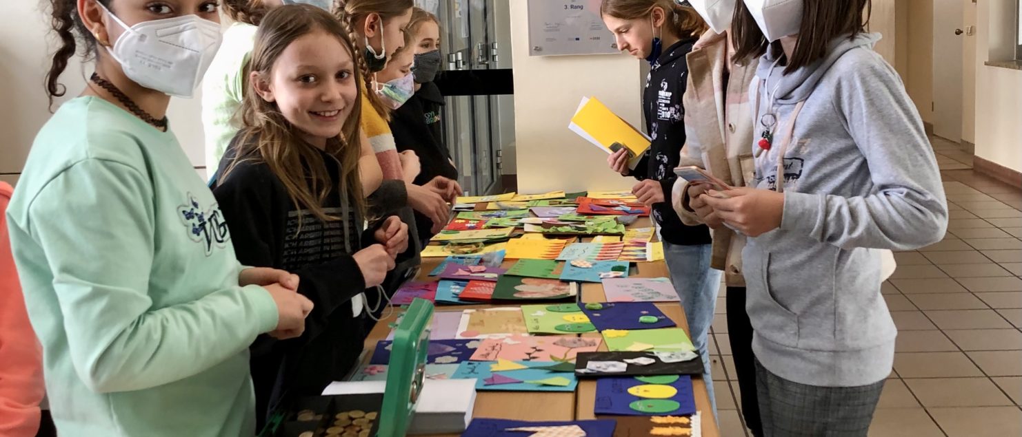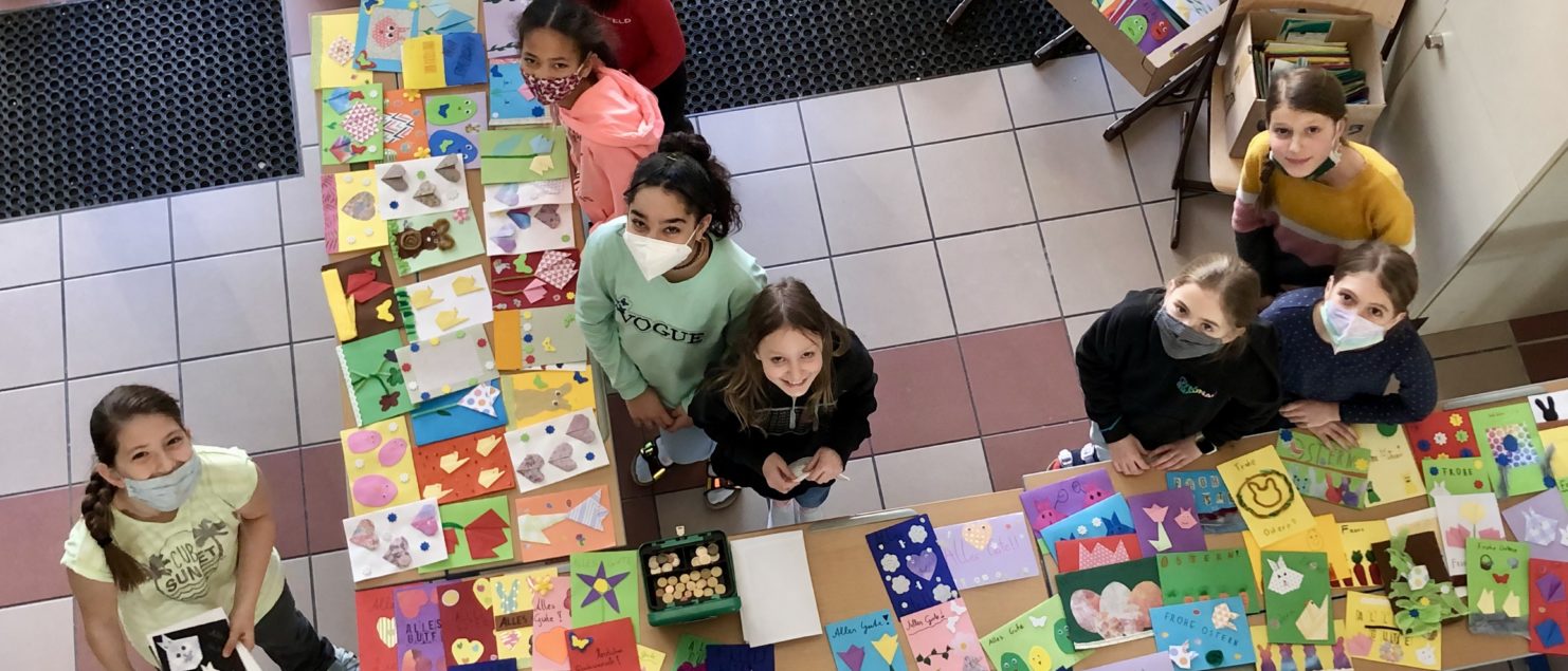 Die Schülerinnen und Schüler der 1D verkauften am Freitag, 11. März in der großen Pause erstmals ihre selbst gestalteten Osterkarten. Der Erlös wird an NACHBAR IN NOT überwiesen.
