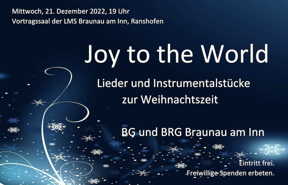 Nach zweimaligem, vielfach bedauertem Entfall gibt es heuer – nicht zuletzt dank der Entschlossenheit von Schülerinnen und Schülern der achten Klassen – wieder ein „Joy to the World“-Weihnachtskonzert. Es findet am Mittwoch, 21. Dezember, um 19:00 Uhr im Vortragssaal der Landesmusikschule in Ranshofen statt.