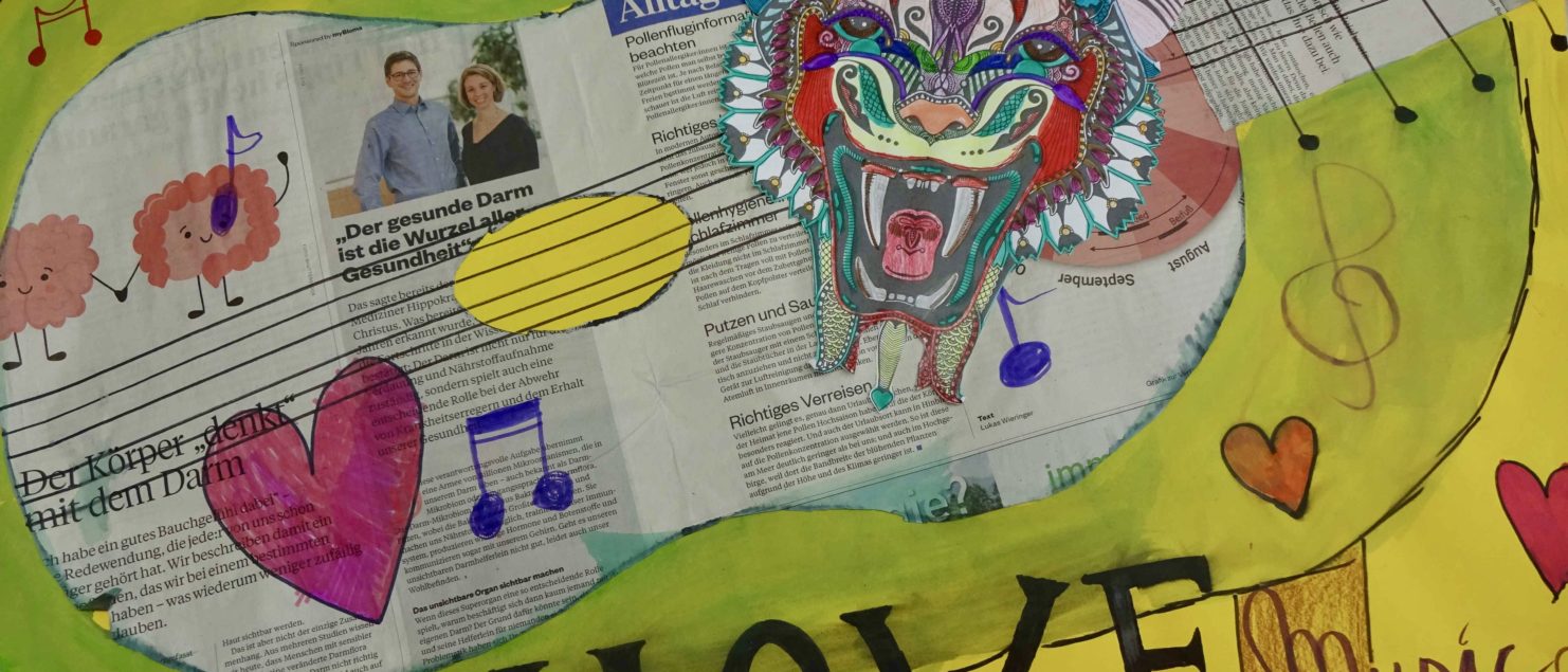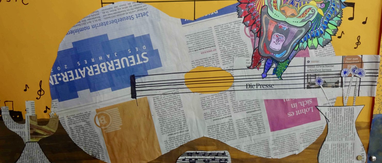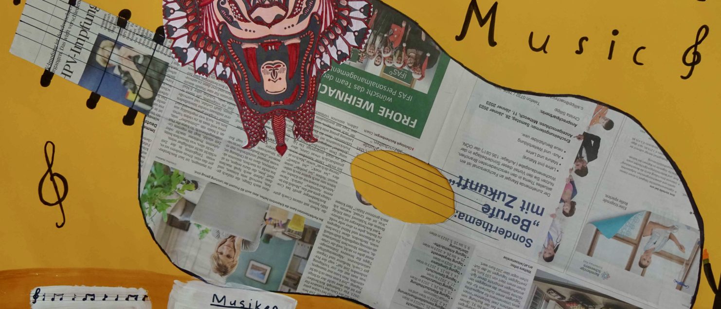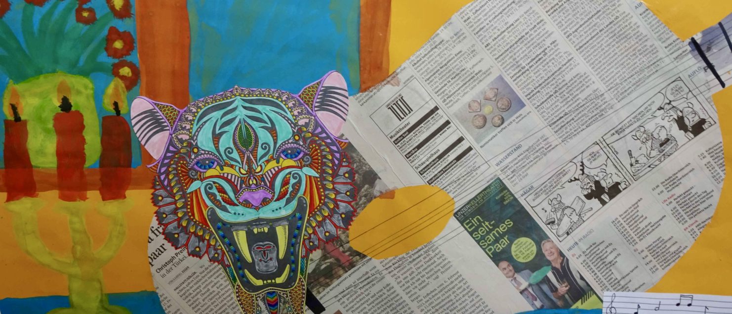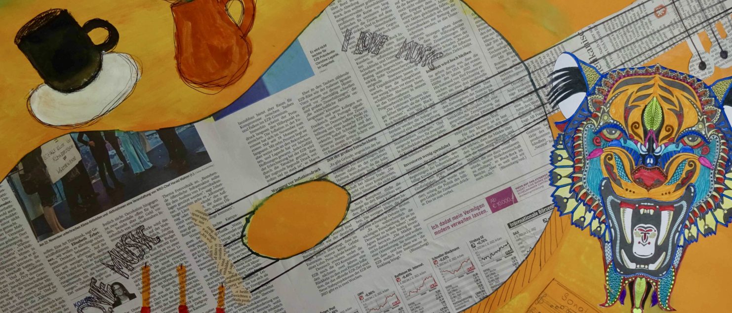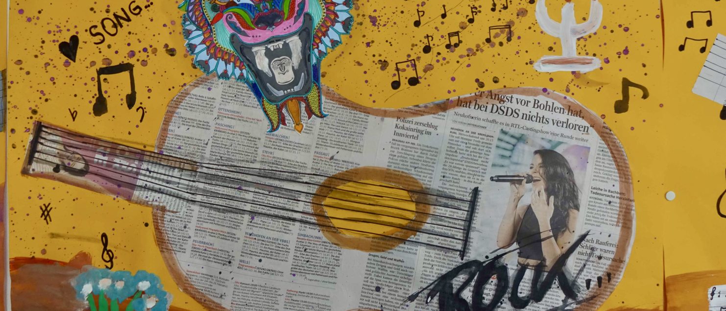 Die Collagen mit Gitarre und Tisch entstanden im BE-Unterricht der 3B-, der 3C- und der 3D-Klasse. Die Schülerinnen und Schüler sollten Spaß daran haben, mit Zeitungspapier zu formen und zu gestalten. Ein Blumenstrauß, ein Kandelaber, eine Tasse, ein Notenblatt und die Schrift sollten zeichnerisch oder malerisch ergänzt werden.