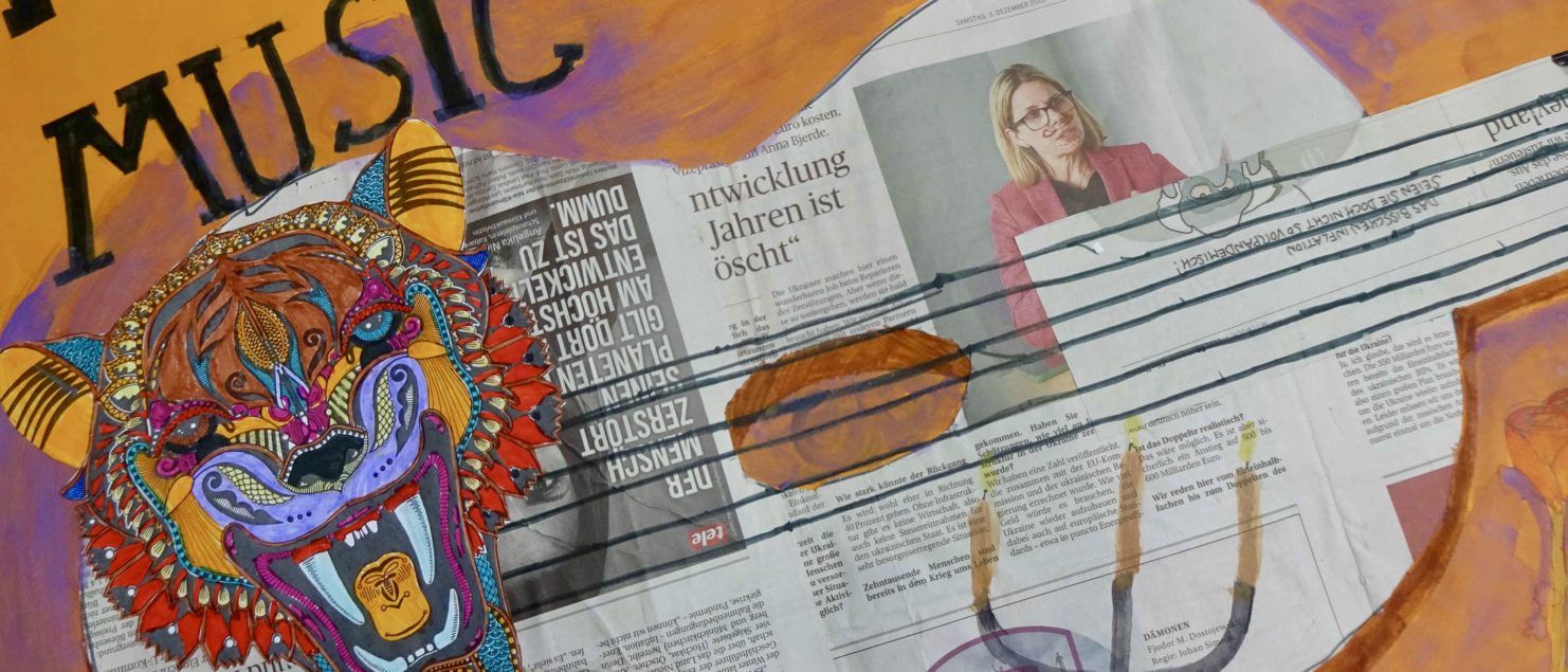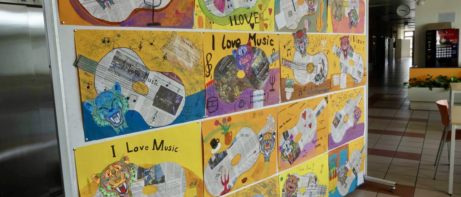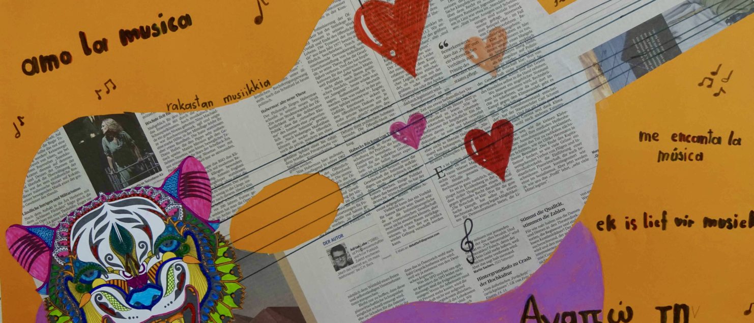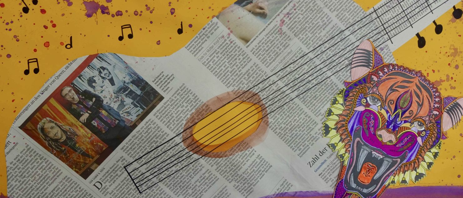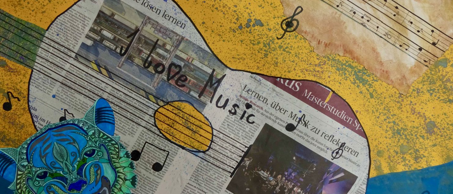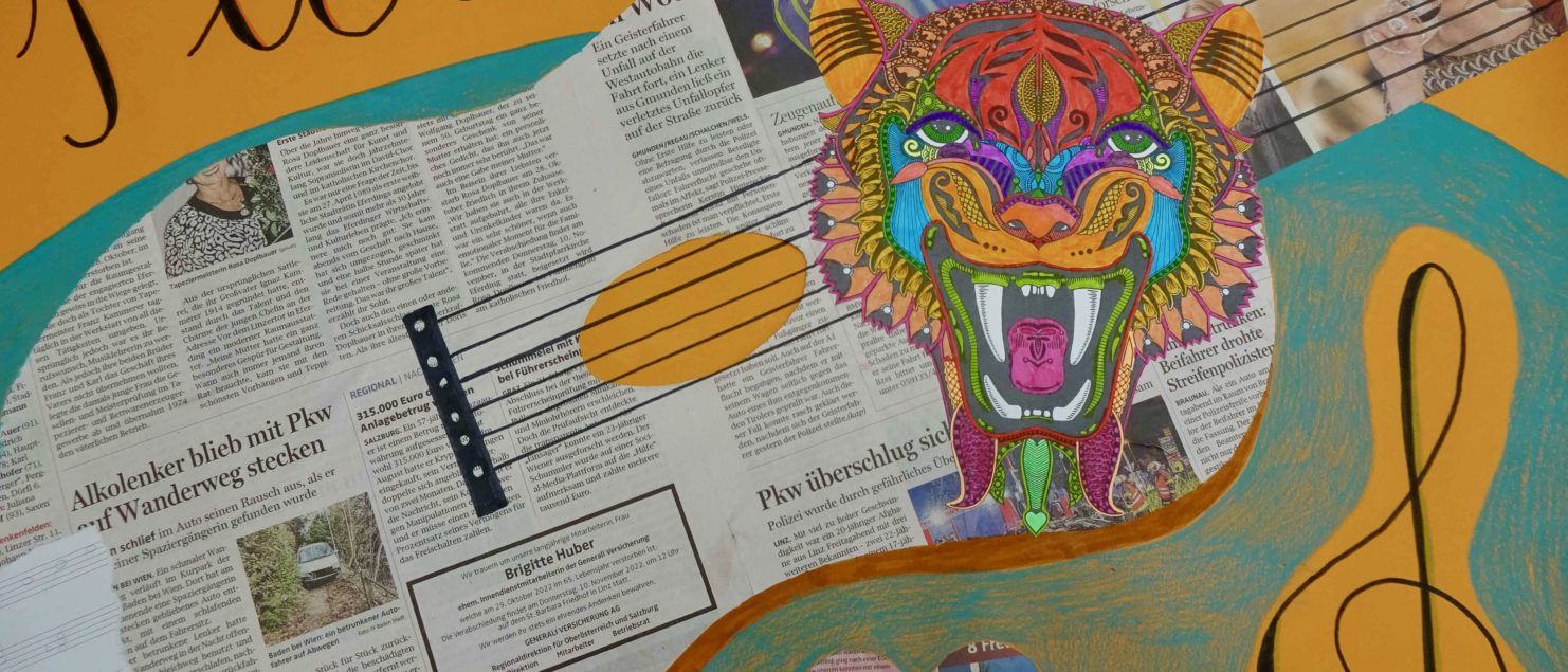 Die Collagen mit Gitarre und Tisch entstanden im BE-Unterricht der 3B-, der 3C- und der 3D-Klasse. Die Schülerinnen und Schüler sollten Spaß daran haben, mit Zeitungspapier zu formen und zu gestalten. Ein Blumenstrauß, ein Kandelaber, eine Tasse, ein Notenblatt und die Schrift sollten zeichnerisch oder malerisch ergänzt werden.