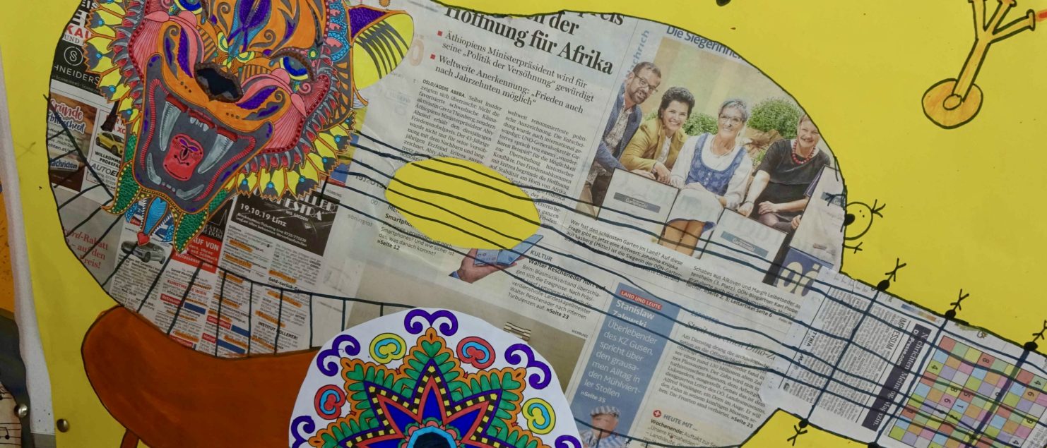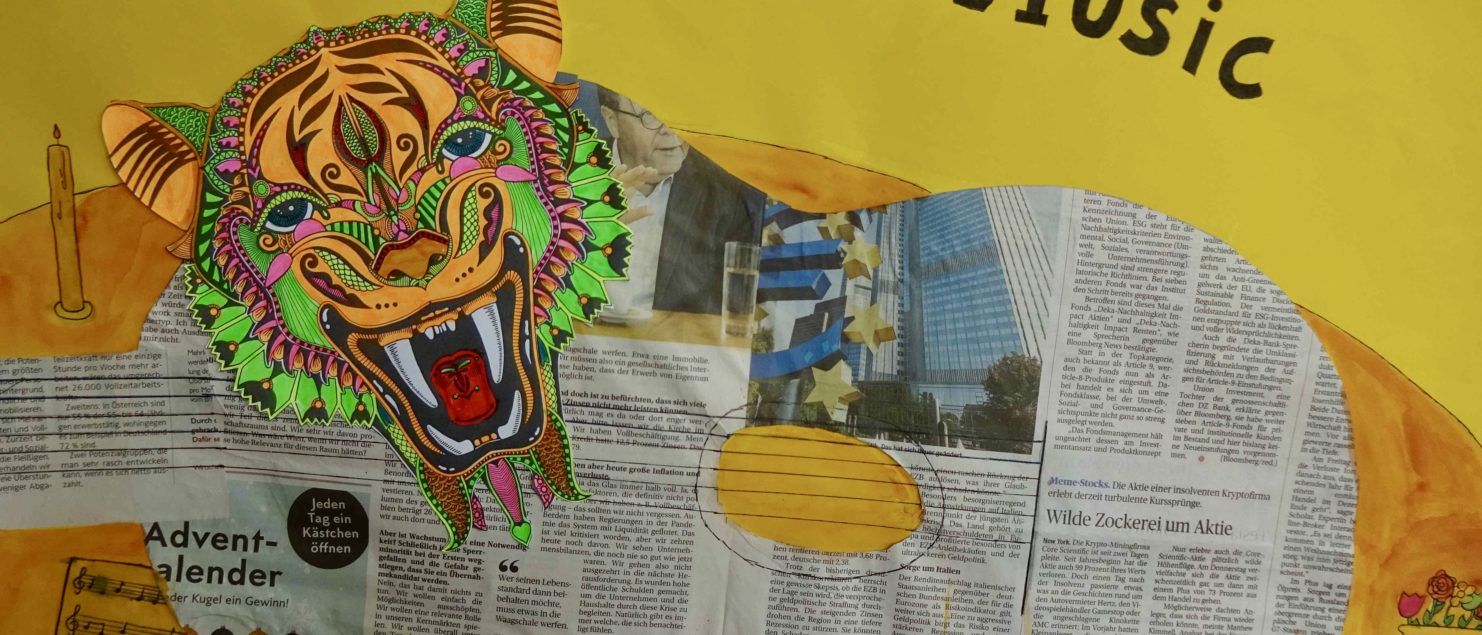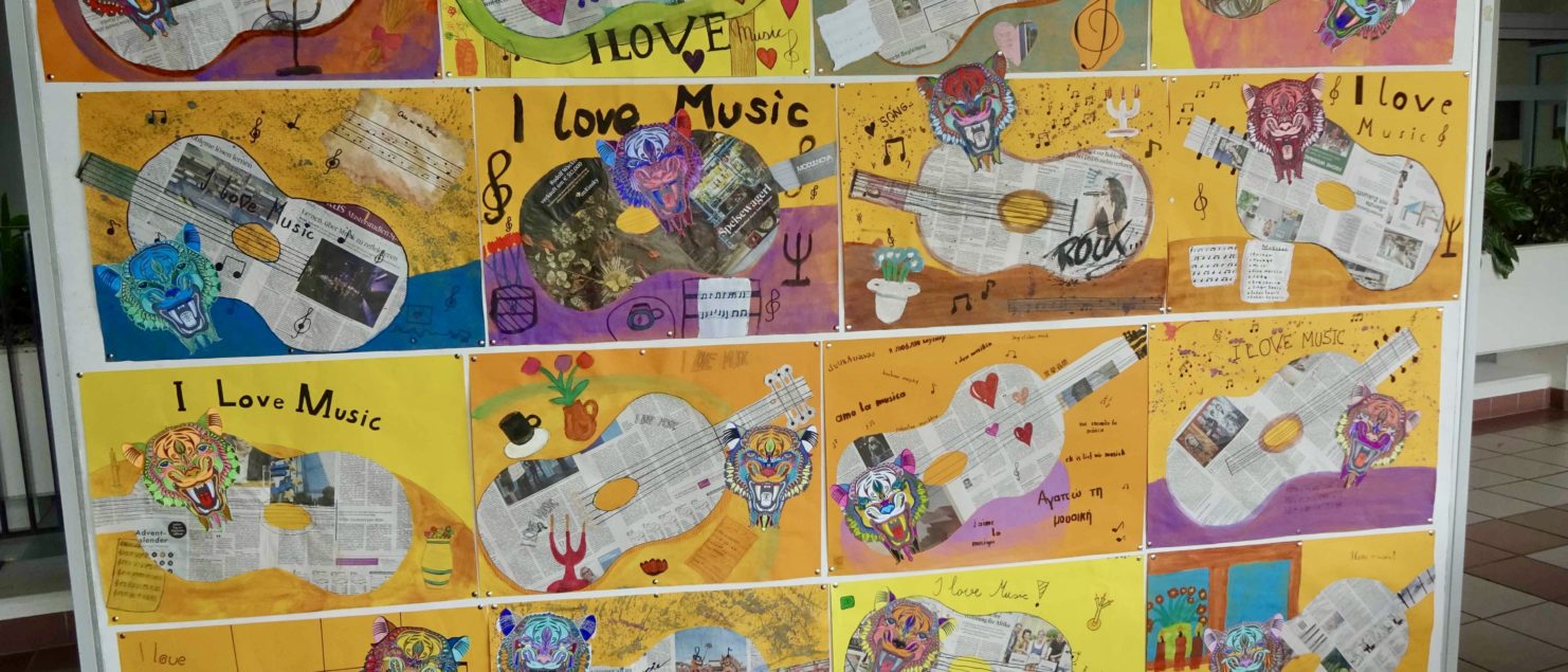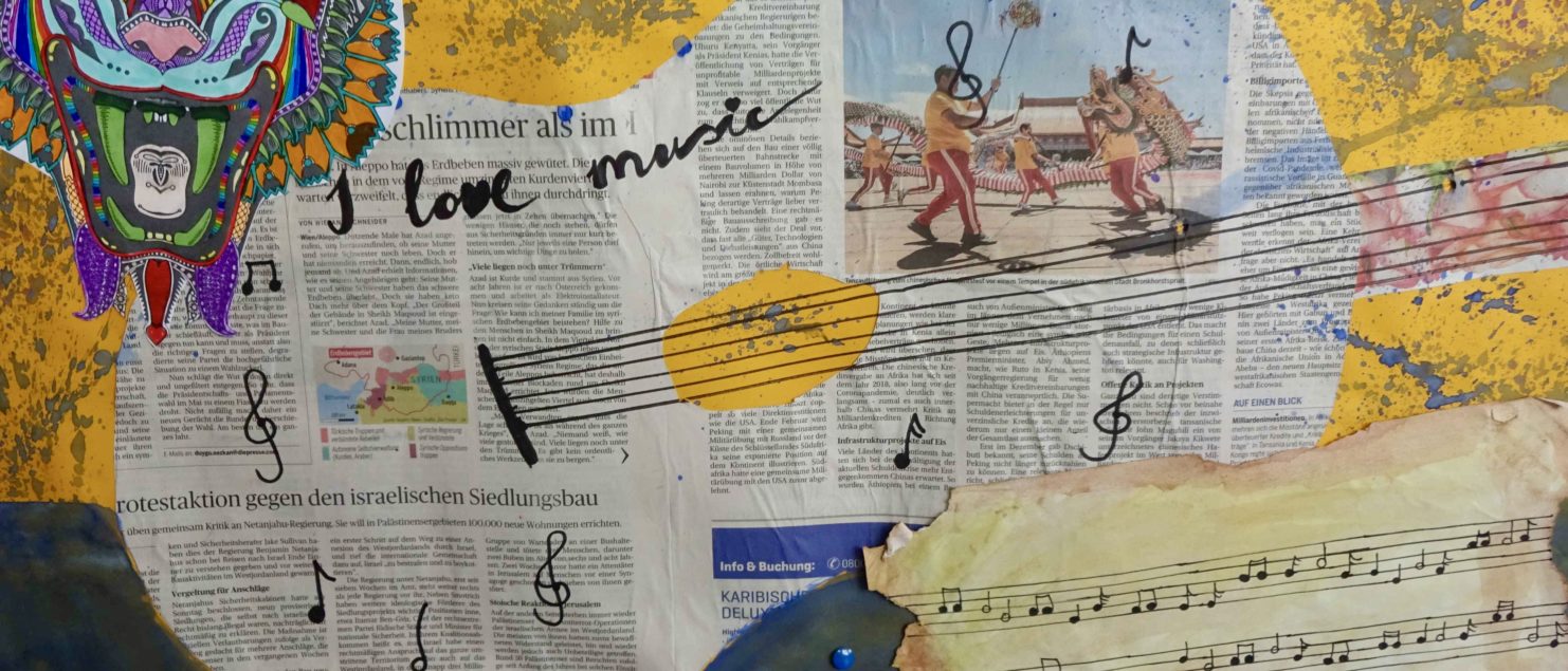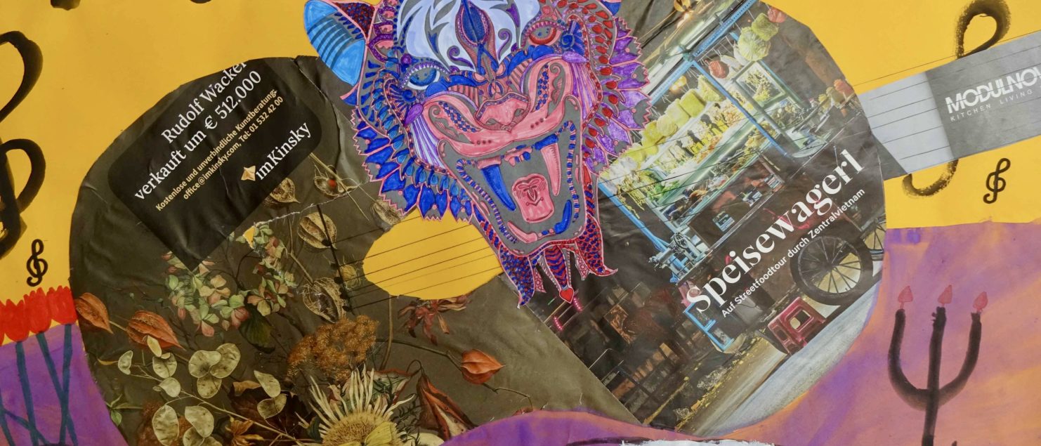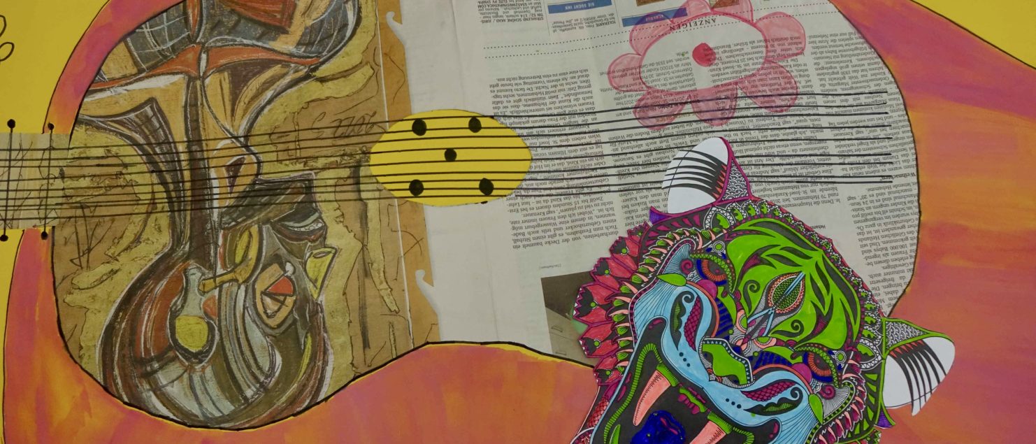 Die Collagen mit Gitarre und Tisch entstanden im BE-Unterricht der 3B-, der 3C- und der 3D-Klasse. Die Schülerinnen und Schüler sollten Spaß daran haben, mit Zeitungspapier zu formen und zu gestalten. Ein Blumenstrauß, ein Kandelaber, eine Tasse, ein Notenblatt und die Schrift sollten zeichnerisch oder malerisch ergänzt werden.