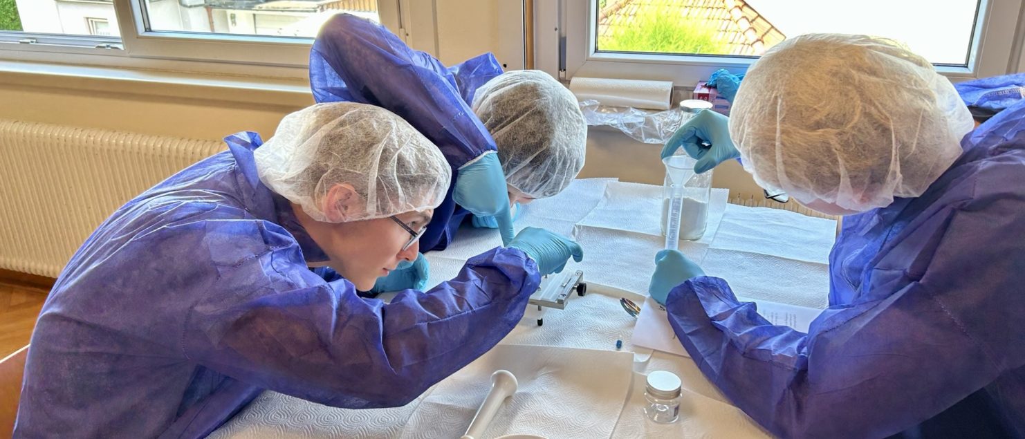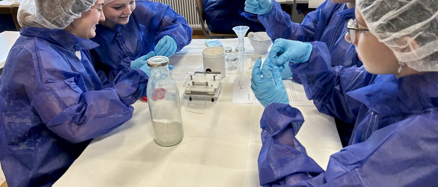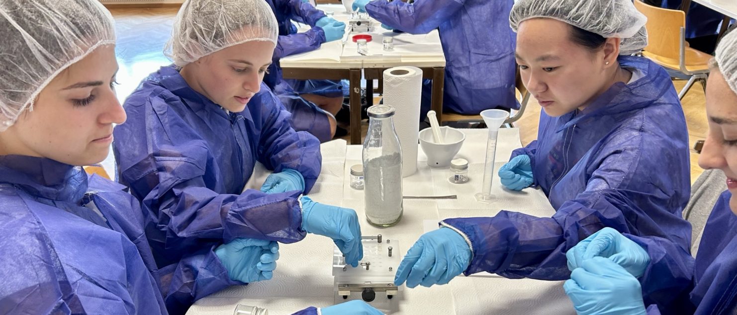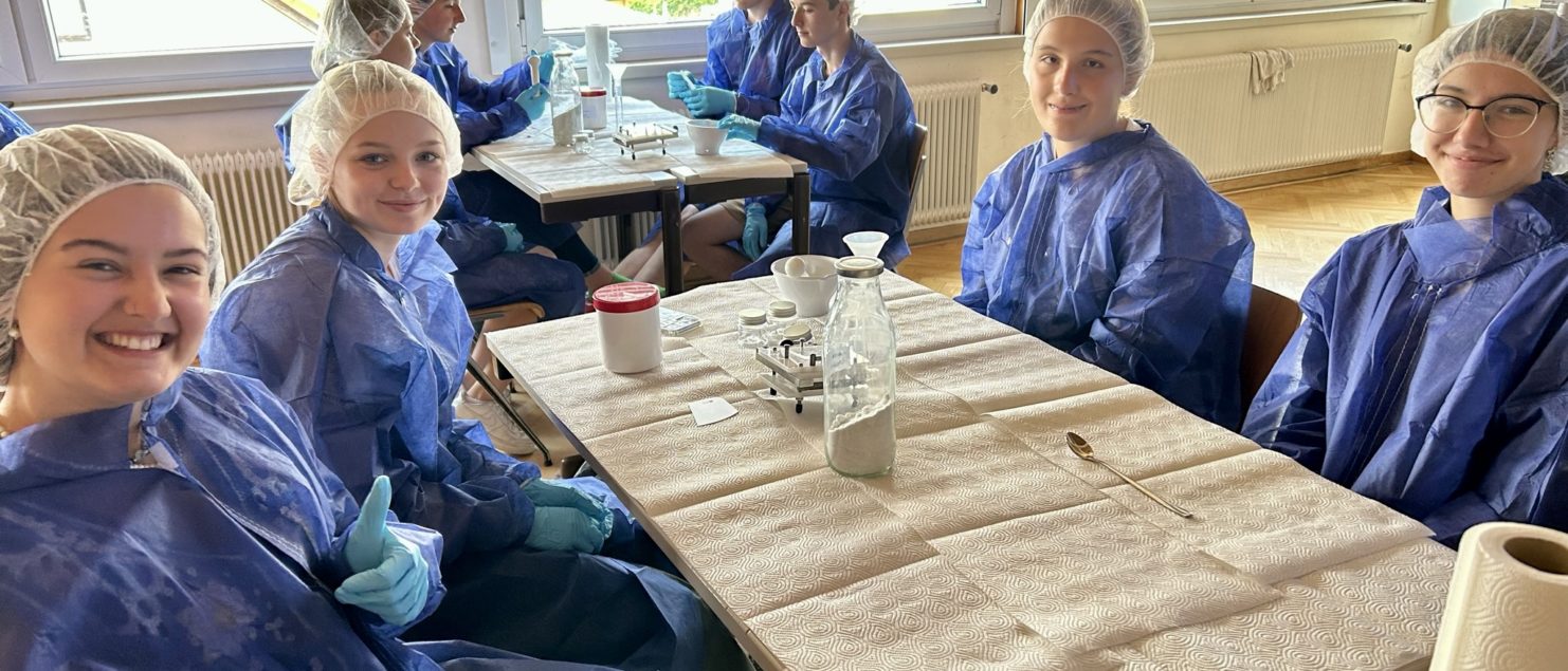In blitzblauen Labormänteln und mit Schutzhauben ausgestattet konnten die Schülerinnen und Schüler der 7. Klassen am 28. Juni ausprobieren, wie man als Pharmazeut*in Kapseln herstellt.