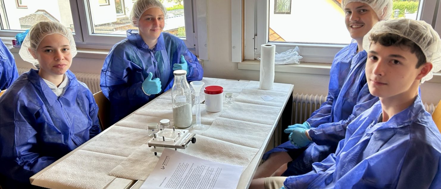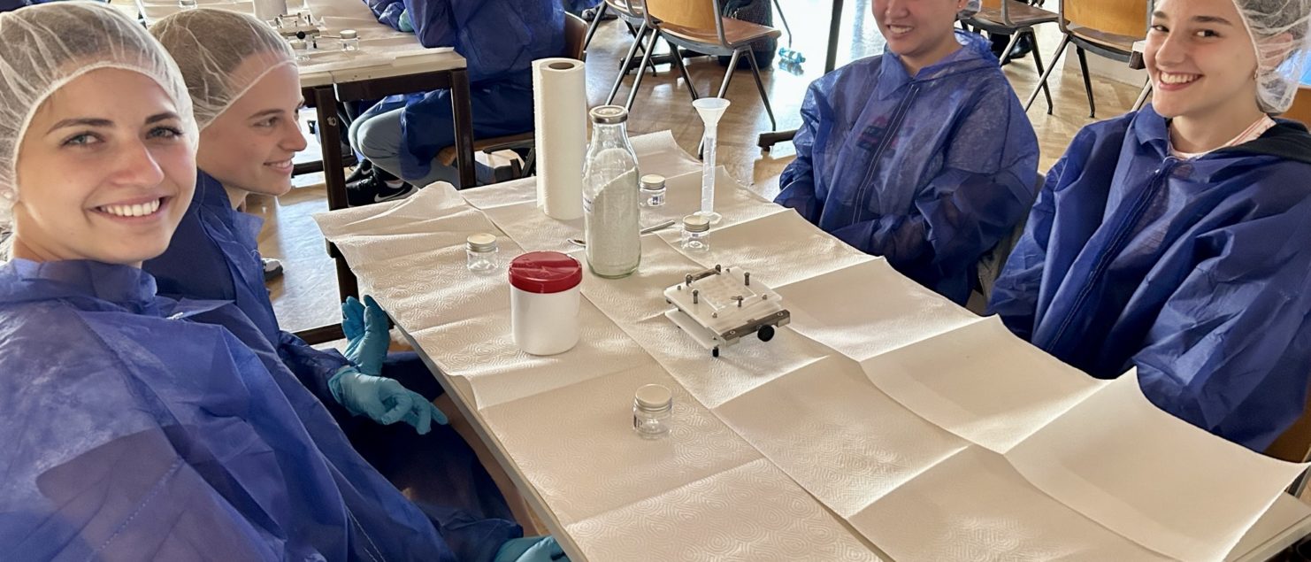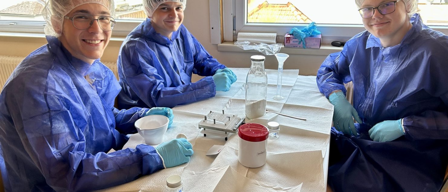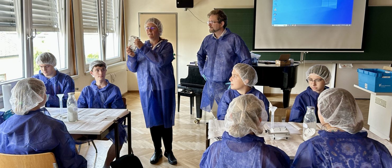 In blitzblauen Labormänteln und mit Schutzhauben ausgestattet konnten die Schülerinnen und Schüler der 7. Klassen am 28. Juni ausprobieren, wie man als Pharmazeut*in Kapseln herstellt.