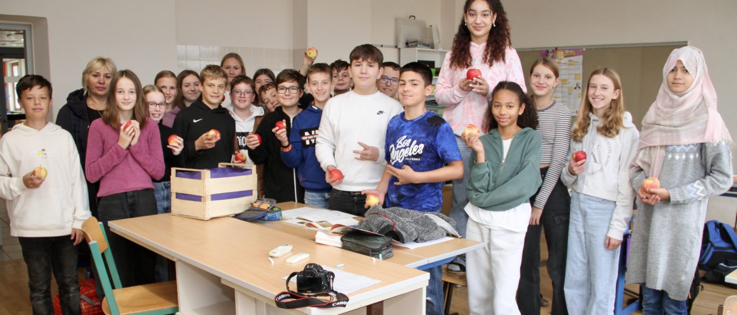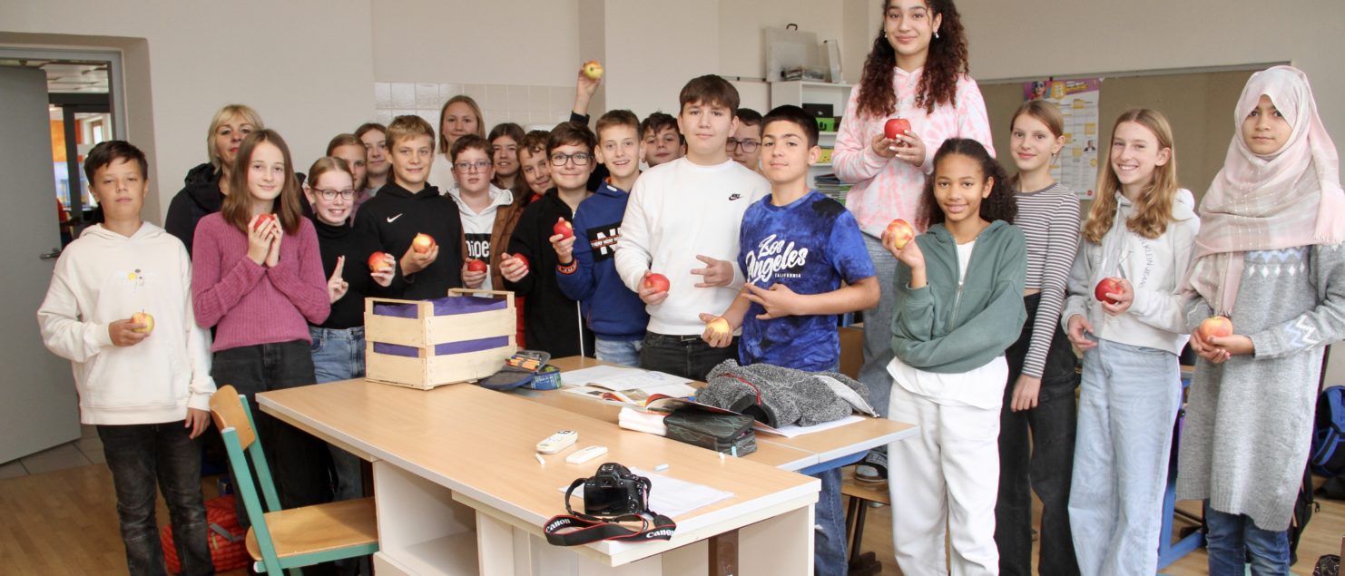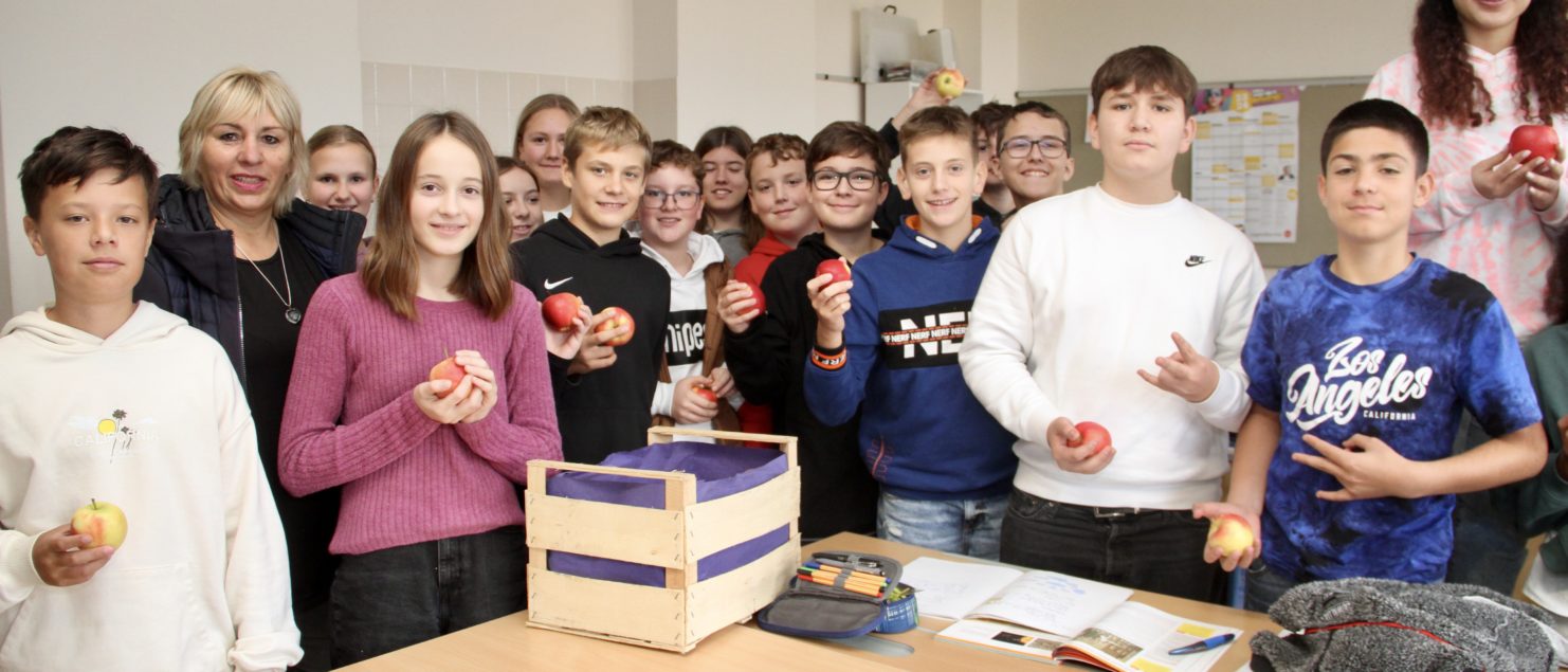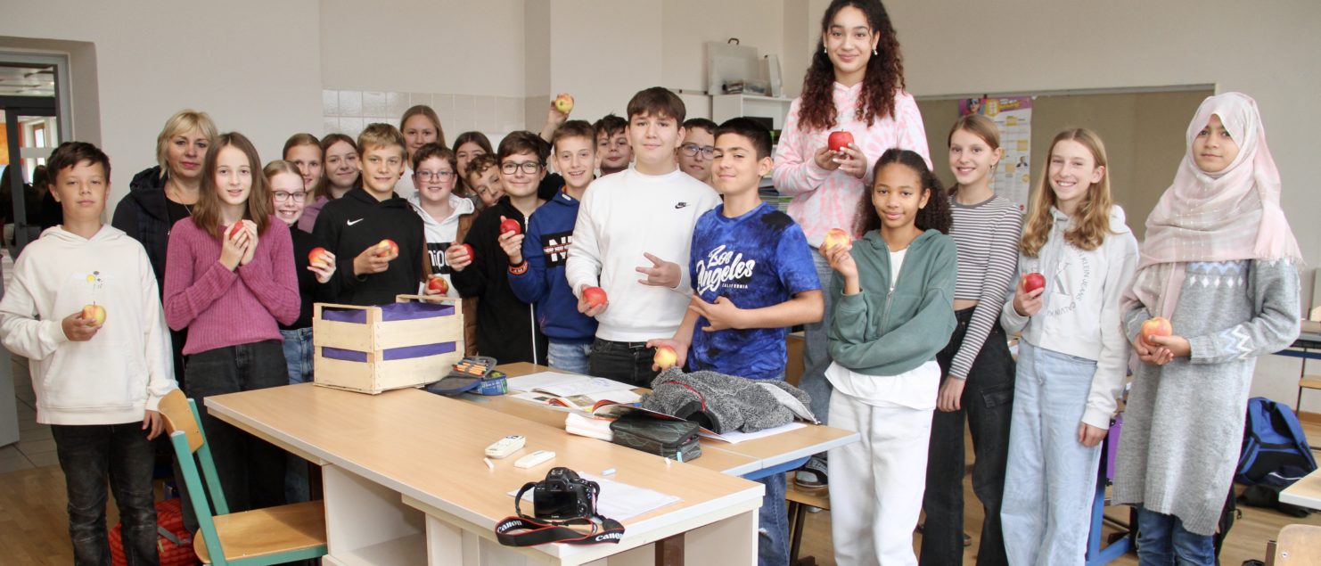 Als Anerkennung gab’s eine Kiste Äpfel, die von Christine Baccili vom Stadtmarketing am 7. November in der Schule überreicht wurde.