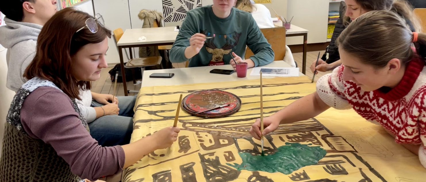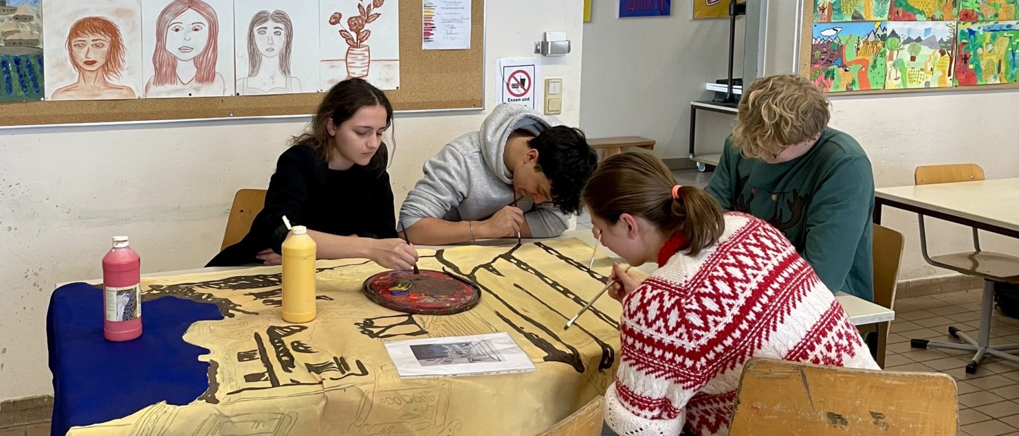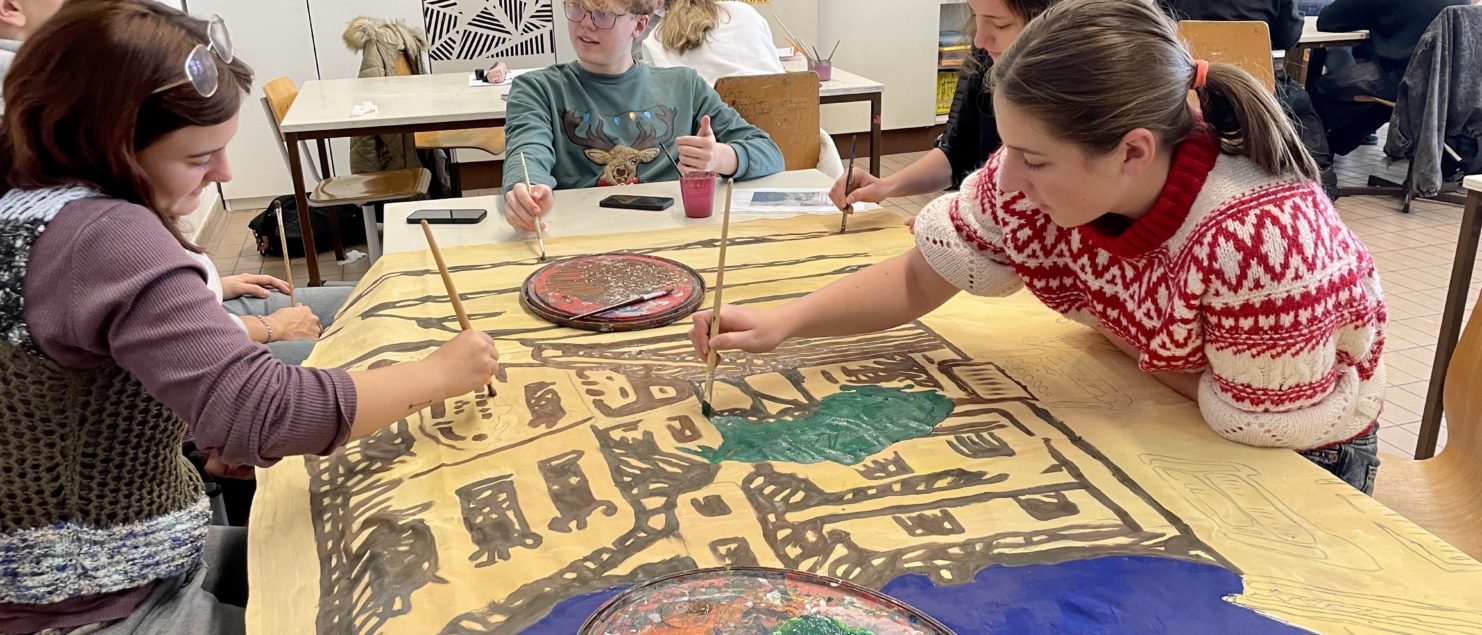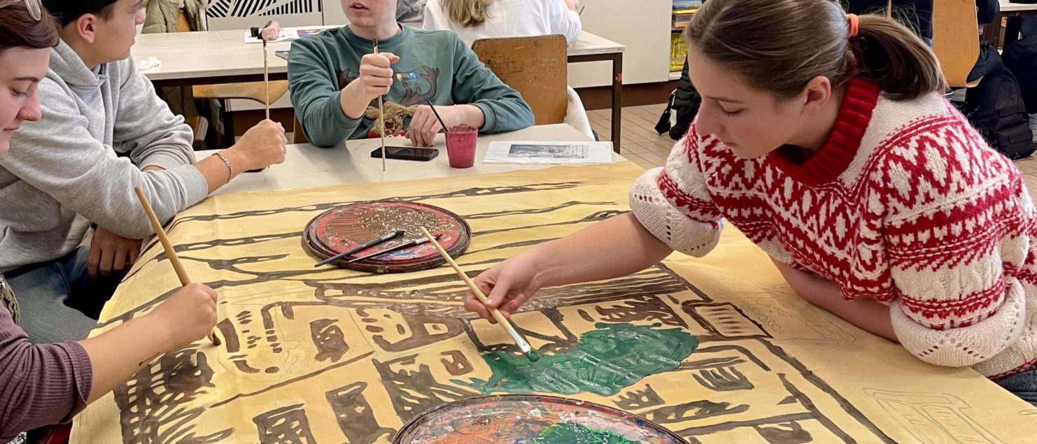 Höhepunkt dieses Abends ist sicherlich die Aufführung des Musicals „Ein Kind und ein König“ von Uli Führe durch Schülerinnen und Schüler unserer Schule. Die Instrumentalmusik wird hier von einem Streich- und Blockflötenensemble der Landesmusikschule Braunau beigesteuert. Im Kunstunterricht der achten Klassen wurde zuletzt eifrig am Bühnenbild für das Musical gearbeitet (siehe Fotos).