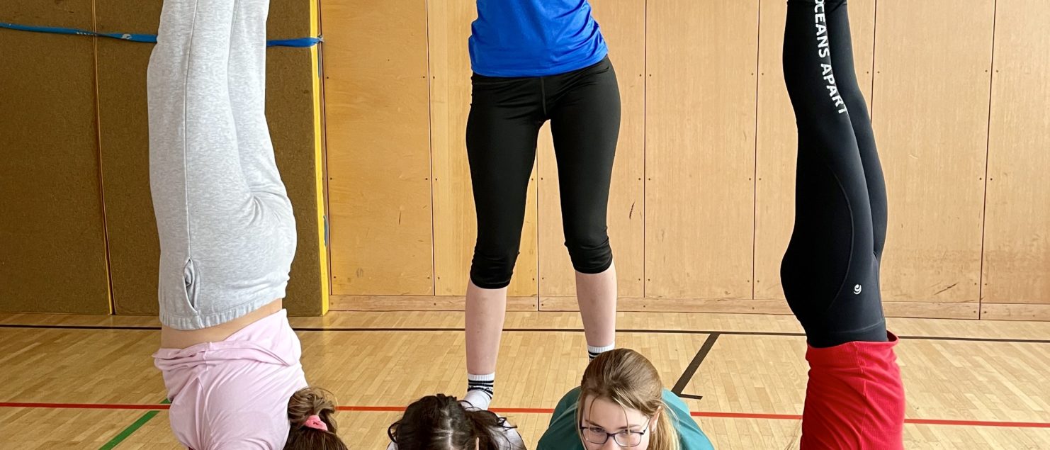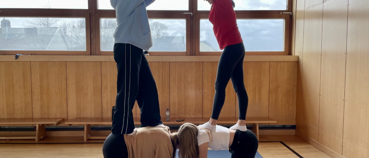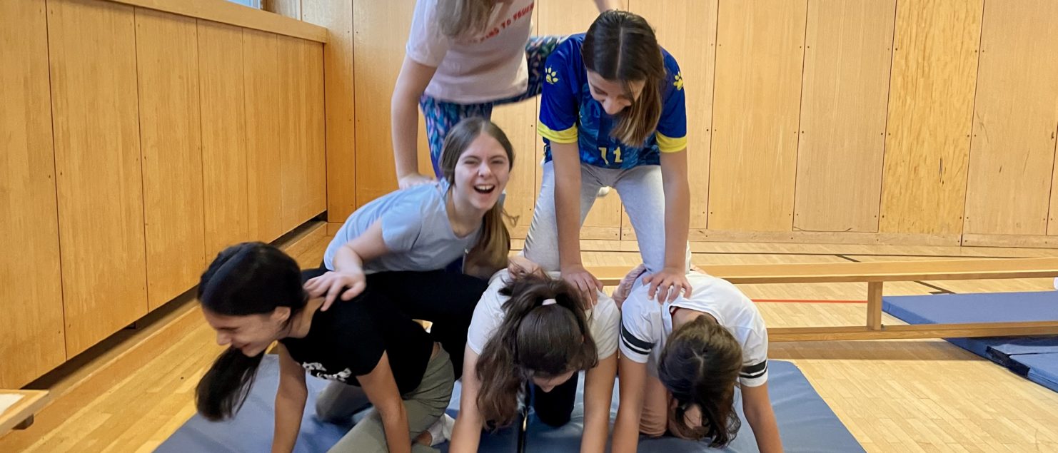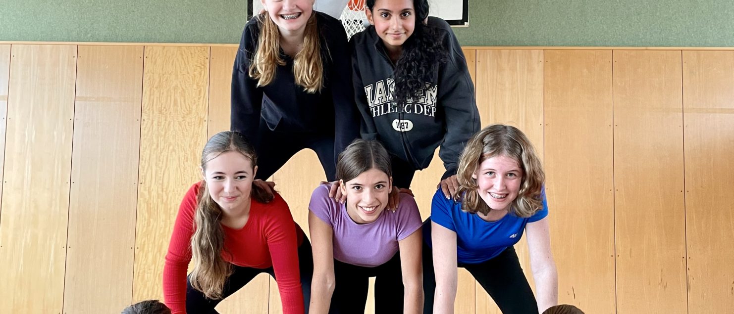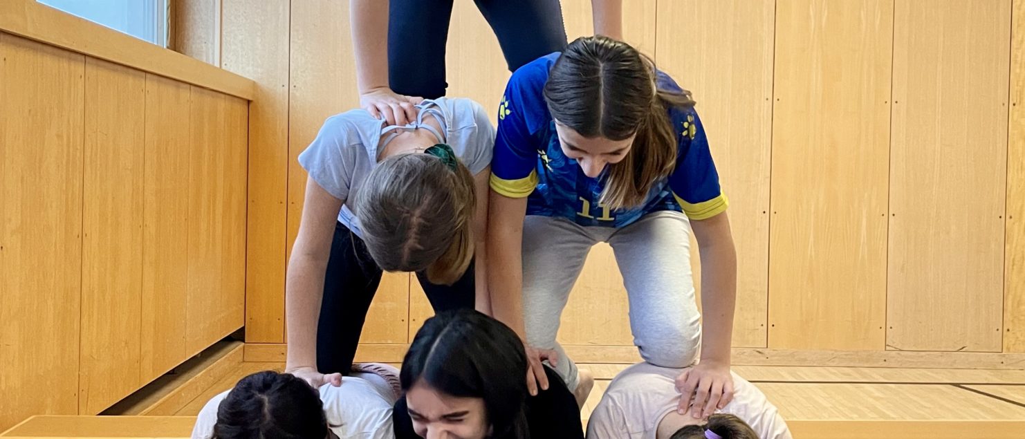 Die Schülerinnen der ersten und der fünften Klassen übten akrobatische Figuren ein, die sie mit Freude vorzeigen.