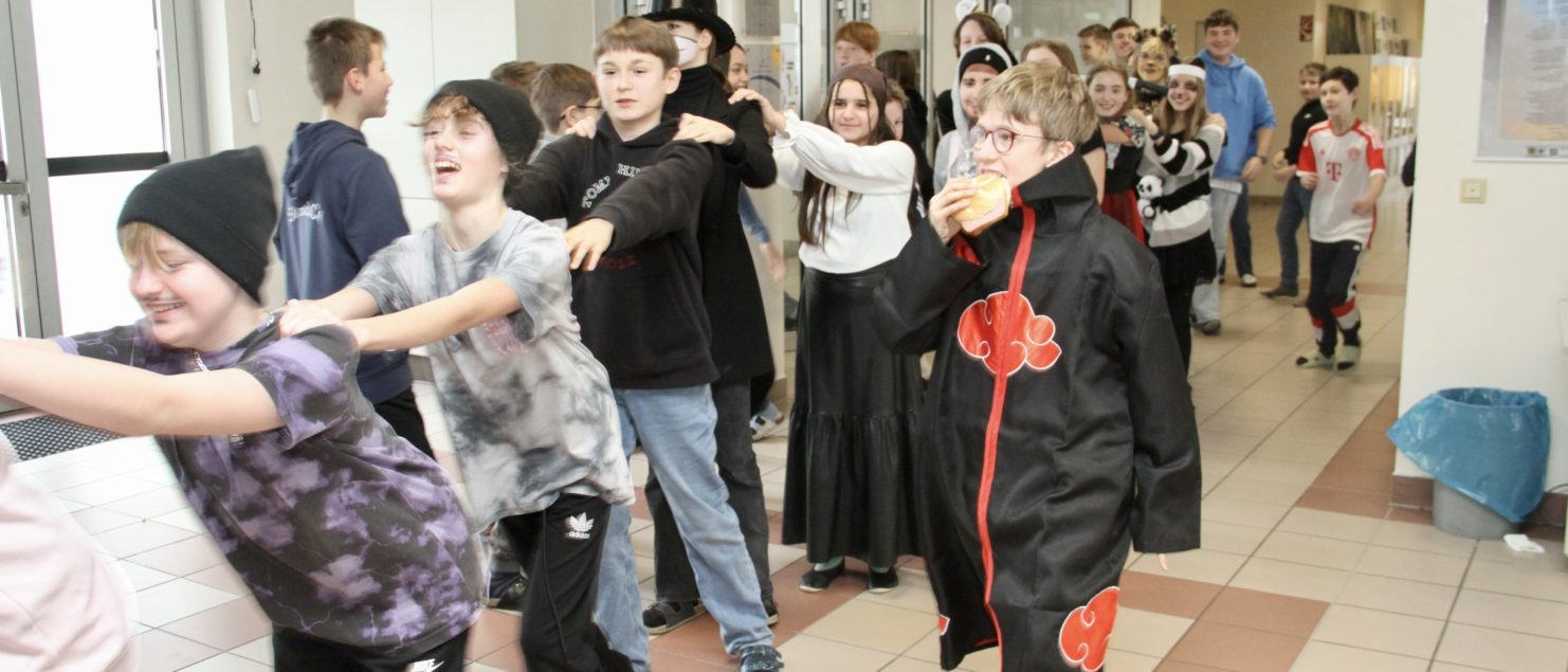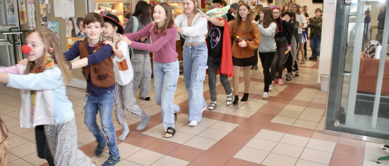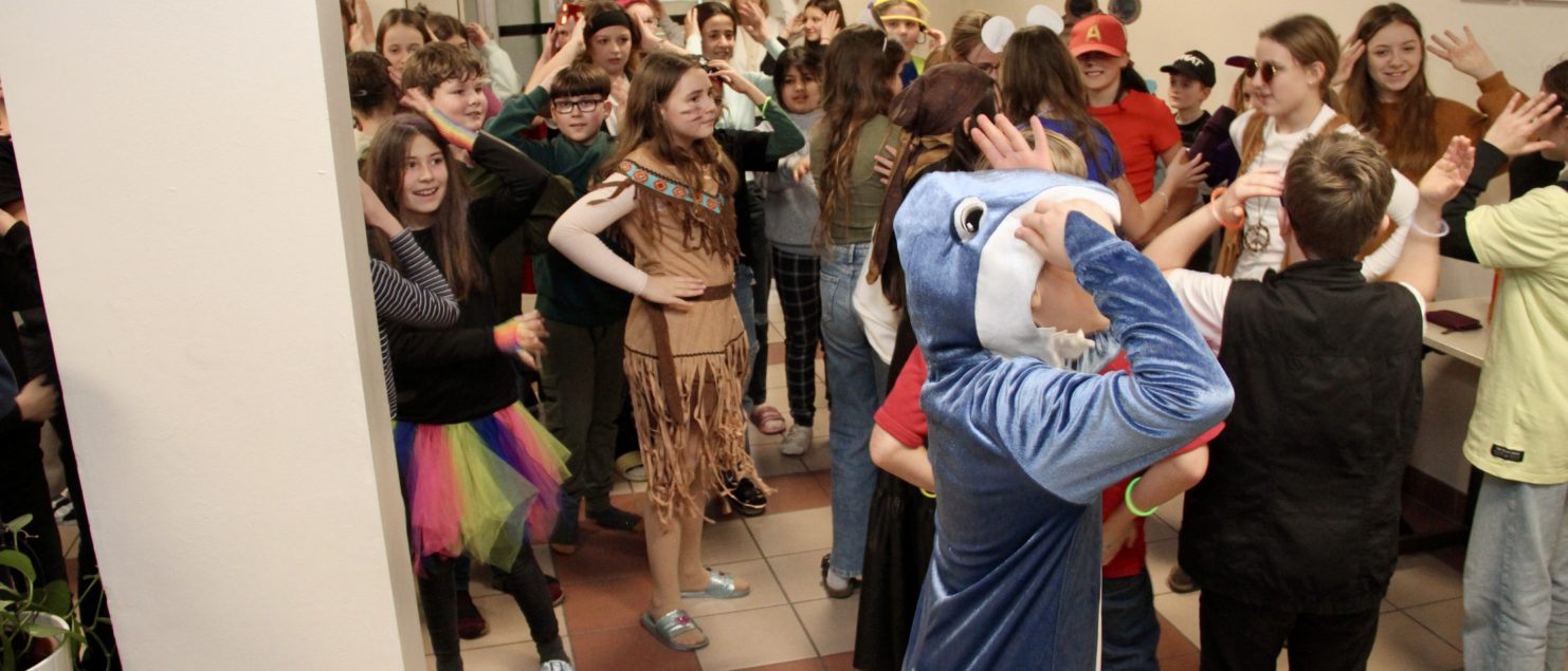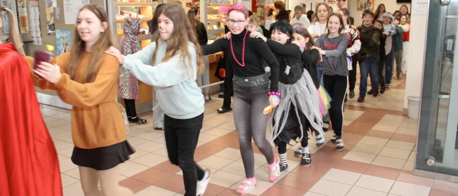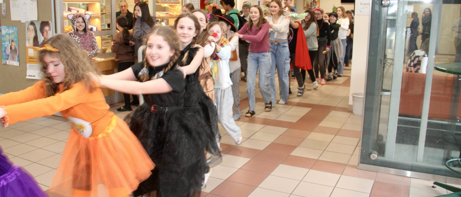 Ein besonderes Highlight war die Polonaise in der großen Pause, angestiftet und angeführt von Administrator Matthias Kritzinger. Der Faschingsumzug durchs ganze Schulgebäude mündete in eine Massen-Macarena vor dem Konferenzzimmer …