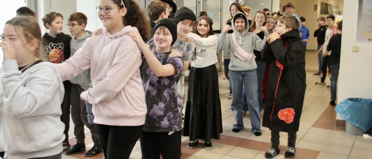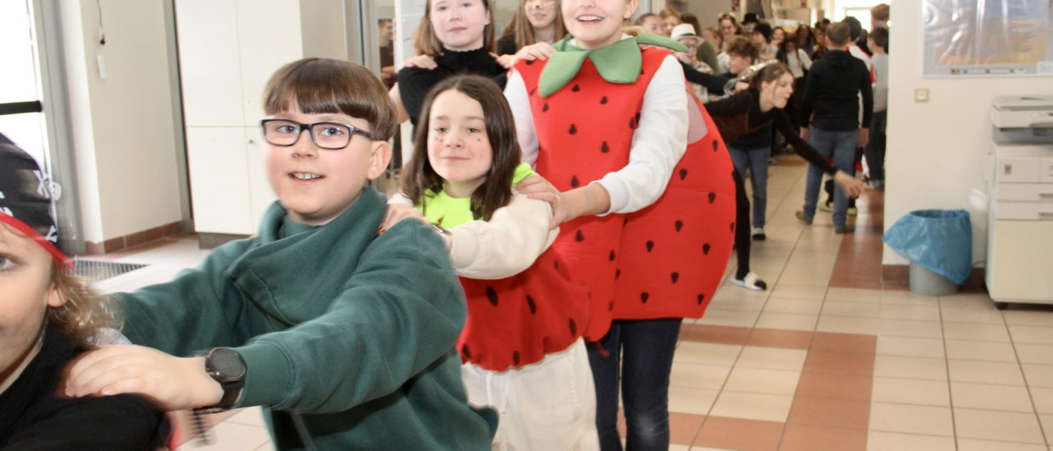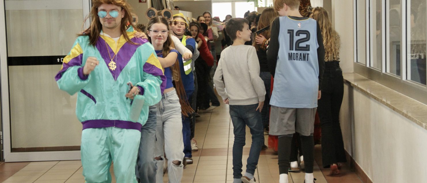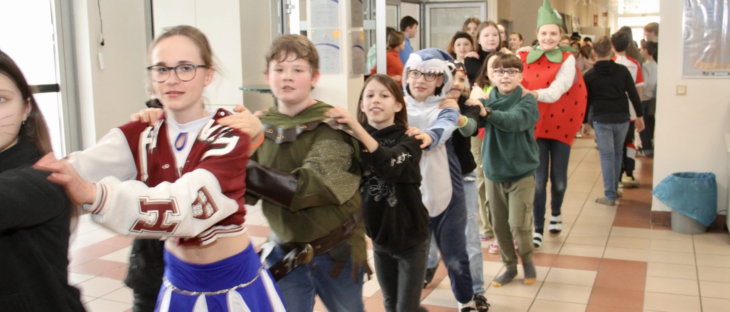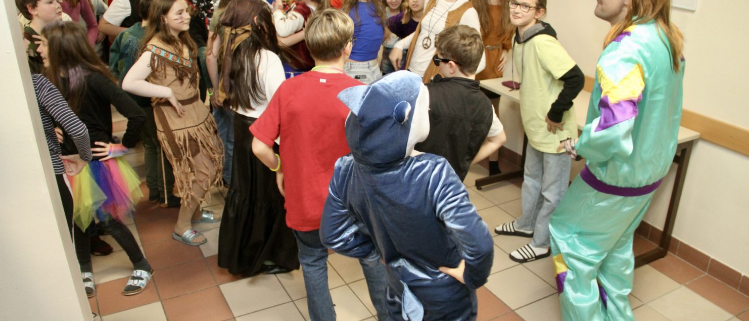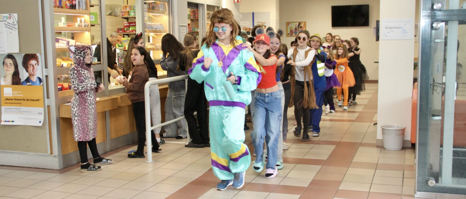 Ein besonderes Highlight war die Polonaise in der großen Pause, angestiftet und angeführt von Administrator Matthias Kritzinger. Der Faschingsumzug durchs ganze Schulgebäude mündete in eine Massen-Macarena vor dem Konferenzzimmer …