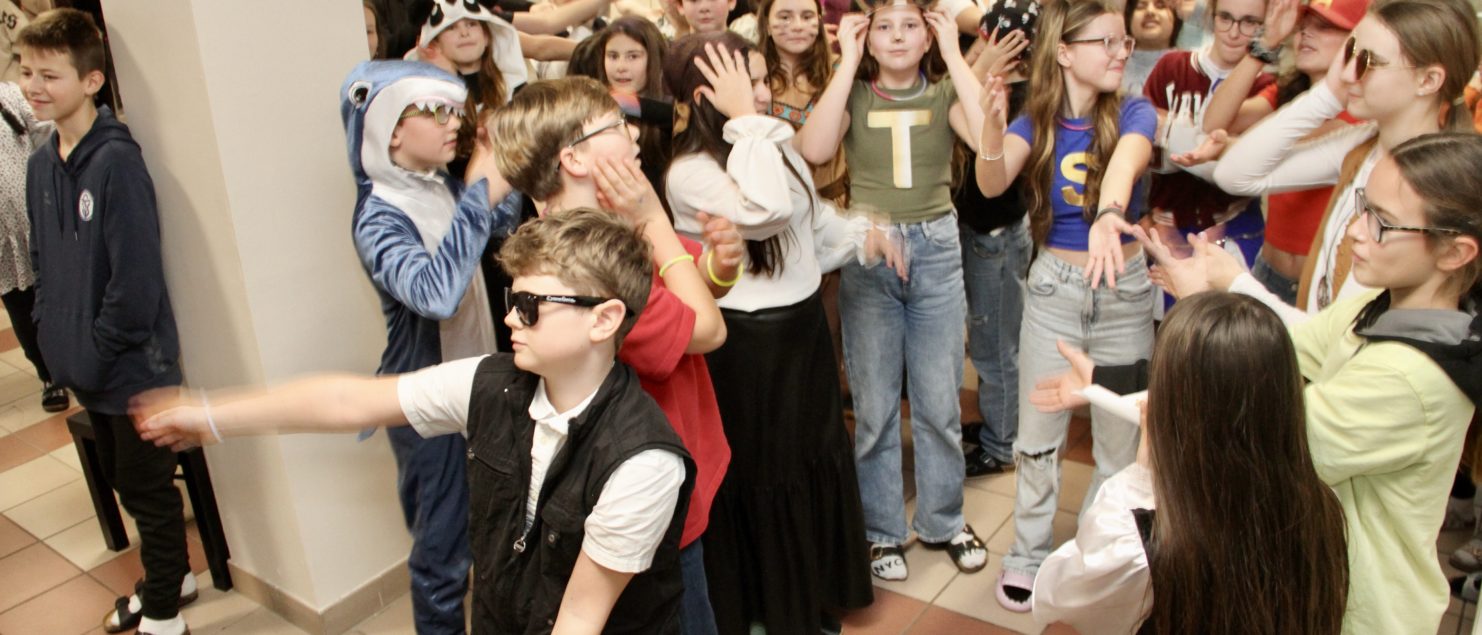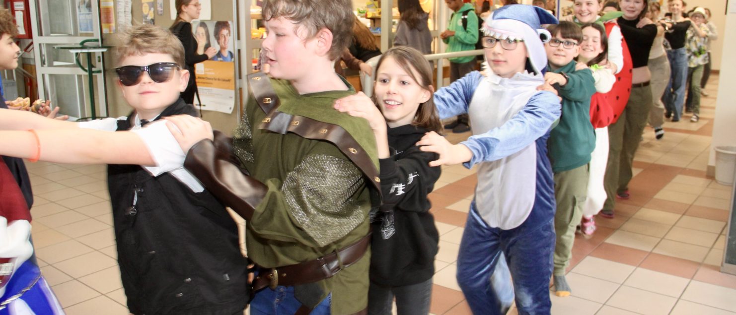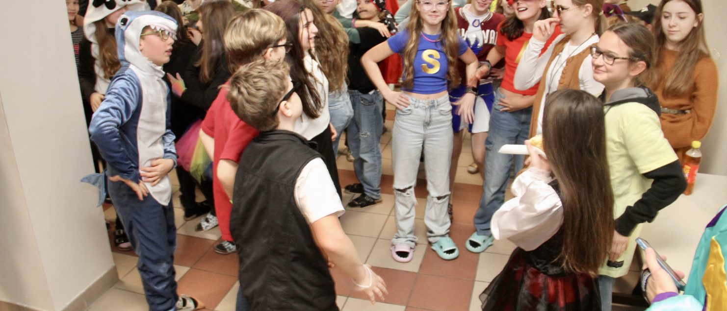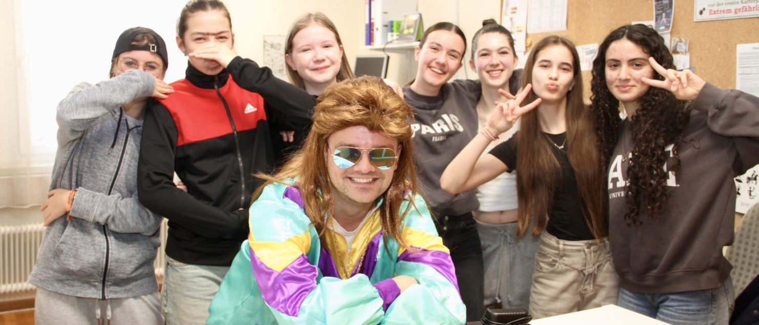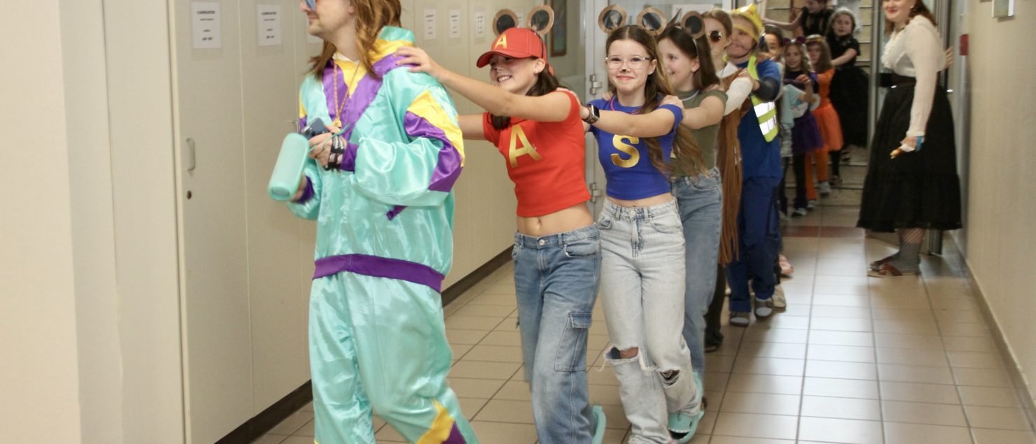 Ein besonderes Highlight war die Polonaise in der großen Pause, angestiftet und angeführt von Administrator Matthias Kritzinger. Der Faschingsumzug durchs ganze Schulgebäude mündete in eine Massen-Macarena vor dem Konferenzzimmer …