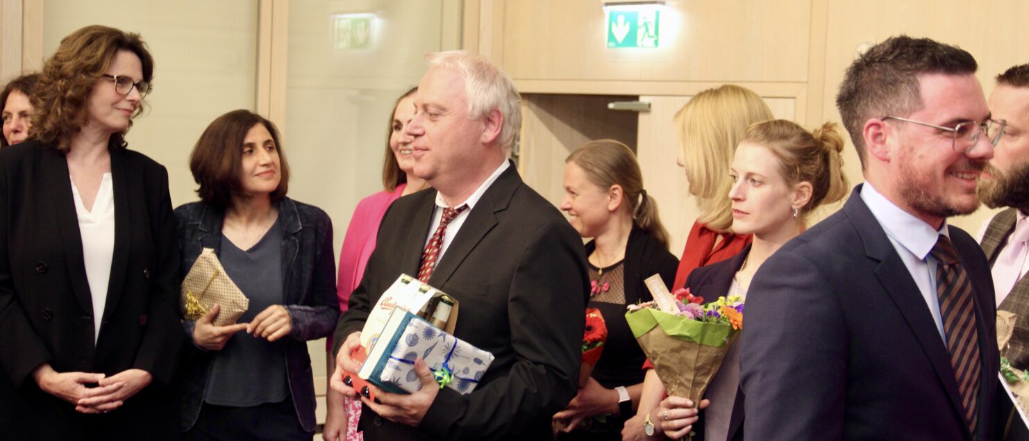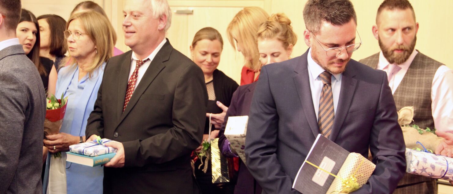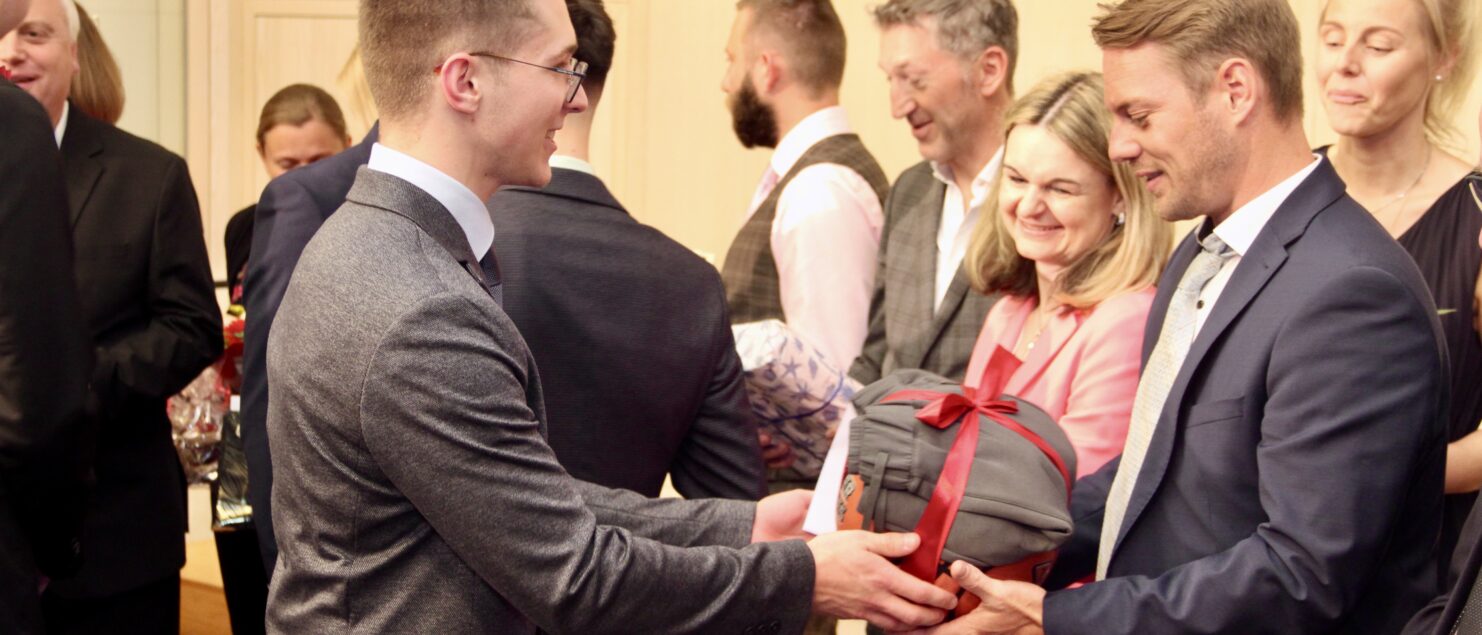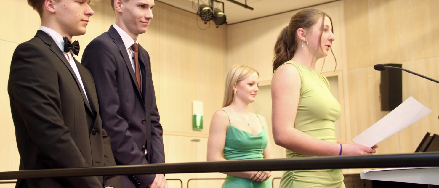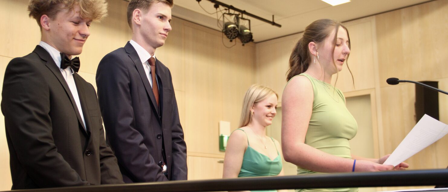 Lilly Rülling und Lea Priewasser von der ehemaligen 8GR-Klasse sowie Leonhard Kunz und Xaver Pichler von der ehemaligen 8B-Klasse bedankten sich im Namen der Maturantinnen und Maturanten in sehr herzlicher und ebenfalls sehr humorvoller Weise bei allen Lehrerinnen und Lehrern. Die Geschenke, die überreicht wurden, waren liebevoll und individuell passend ausgewählt worden.