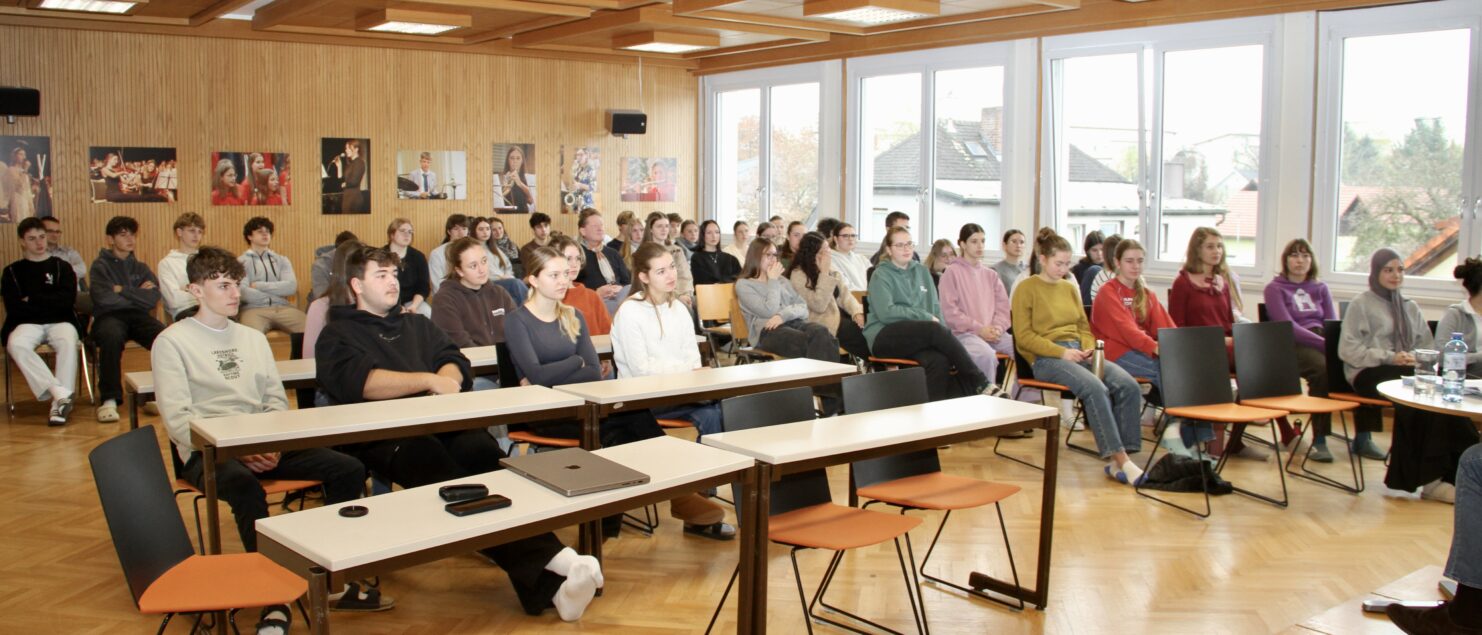 Christoph Kotanko lieferte auch Einschätzungen zur aktuellen politischen Lage in Österreich und beantwortete Fragen zu den möglichen Auswirkungen der US-Wahl oder dem Konflikt in Nahost. Ein Büchertisch der Buchhandlung Lauf sowie ein gemütliches Beisammensein mit Verköstigung nach der Lesung, gestaltet durch Schülerinnen und Schüler der 7. Klassen, rundeten diesen gelungenen Abend ab.