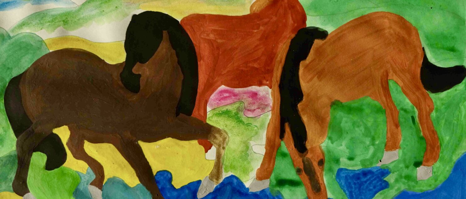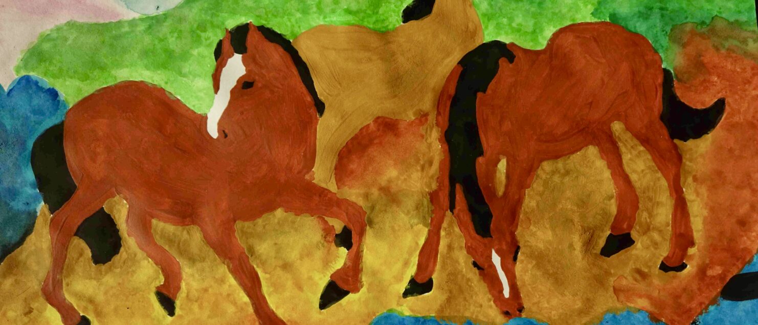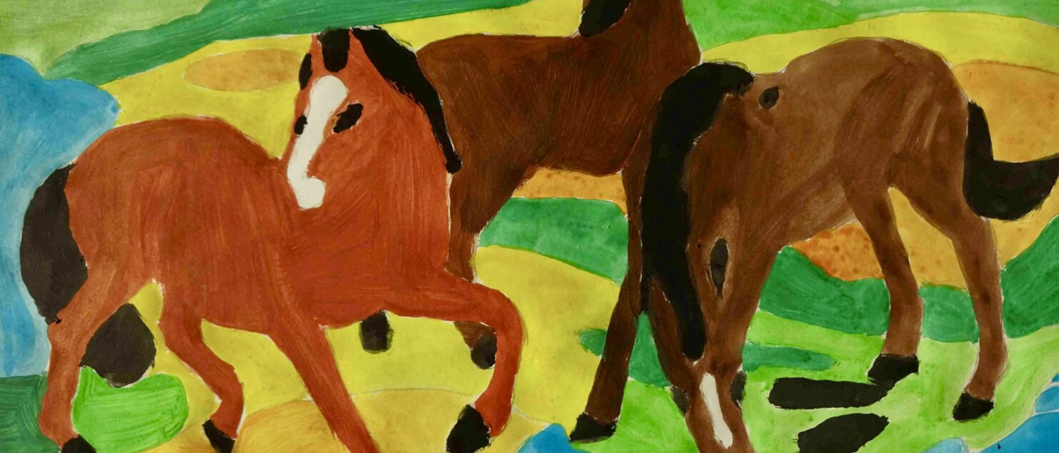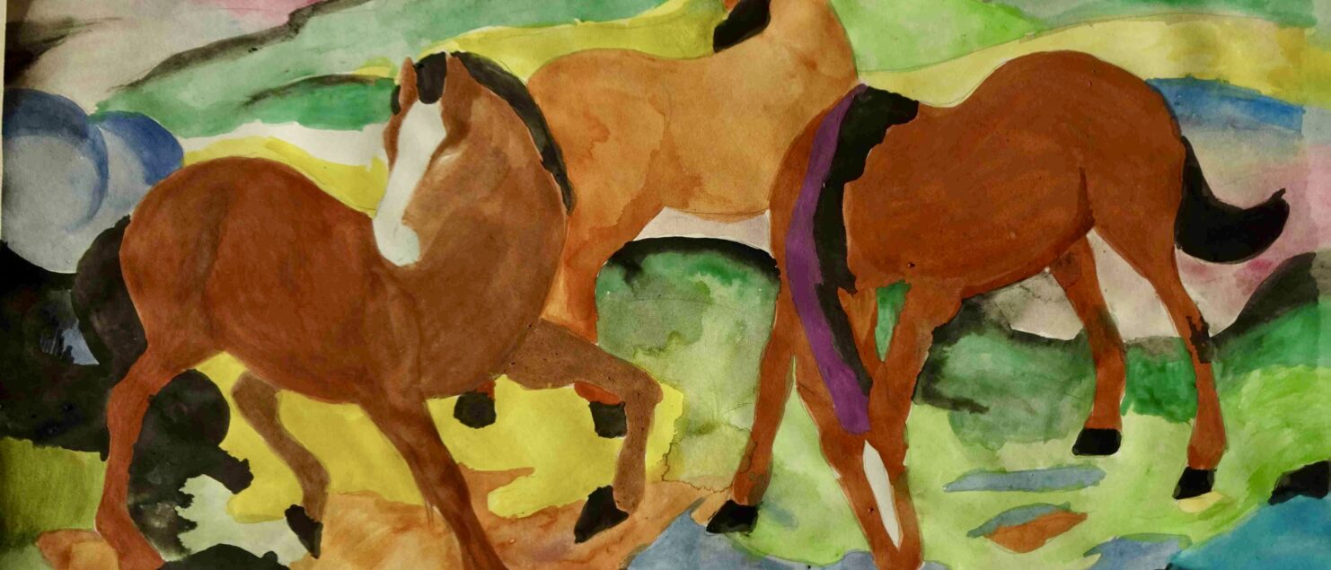 Die Schülerinnen und Schüler malen gerne Tiere, haben aber oft Scheu vor der Darstellung von Pferden, da es ihnen schwerfällt, die Bewegung der Pferde in einem Bild wiederzugeben. Mit Hilfe eines Bildes von Franz Marc, das einem faszinierenden Kompositionsschema folgt, konnte nun „Pferde zeichnen“ geübt werden. Drei Pferde vollführen einen Tanz in diesem Bild. Das erste ist dem Betrachter zugewendet, das mittlere blickt in die Landschaft und das dritte trinkt aus einem Bach im Vordergrund. Somit entsteht eine grandiose Dreieckskomposition. Außerdem besticht Marc immer mit seinen expressiven und leuchtenden Farben.