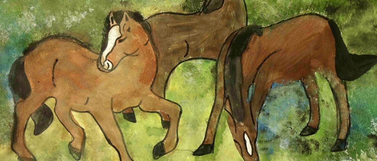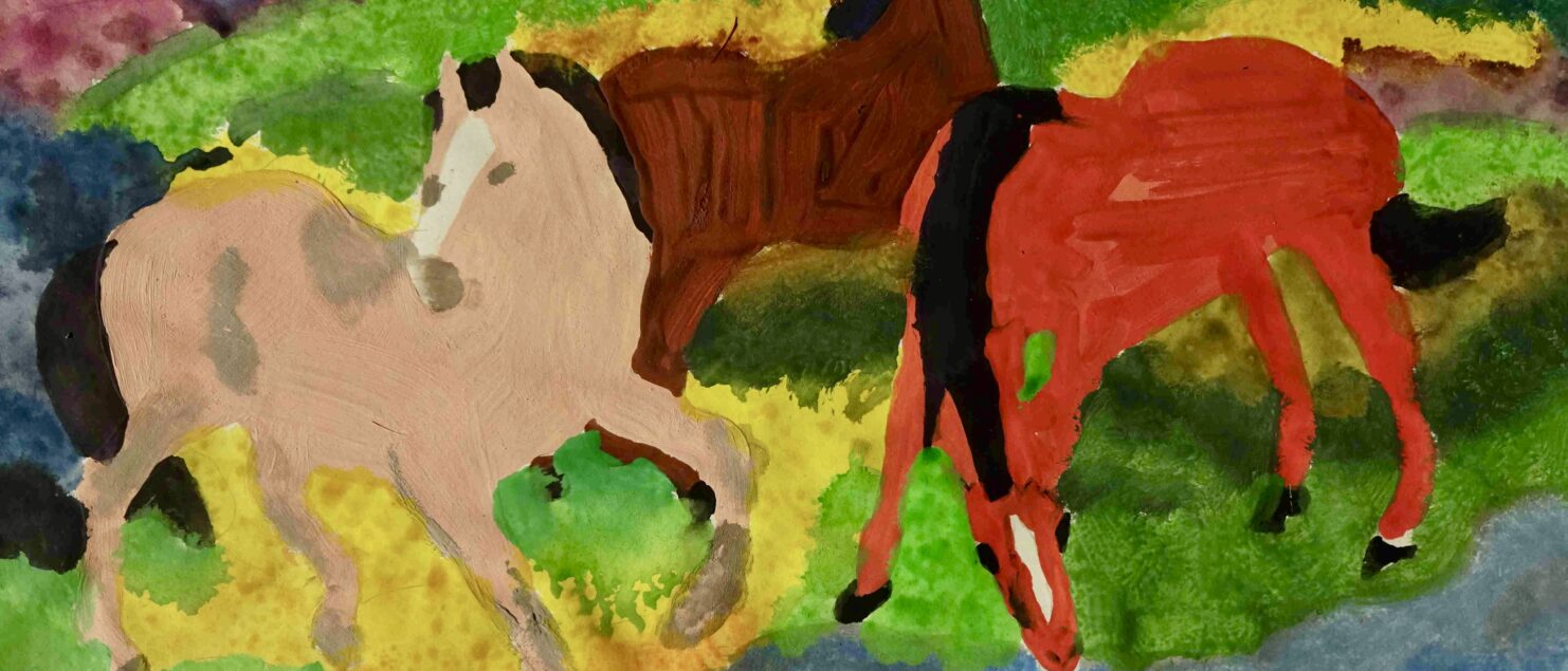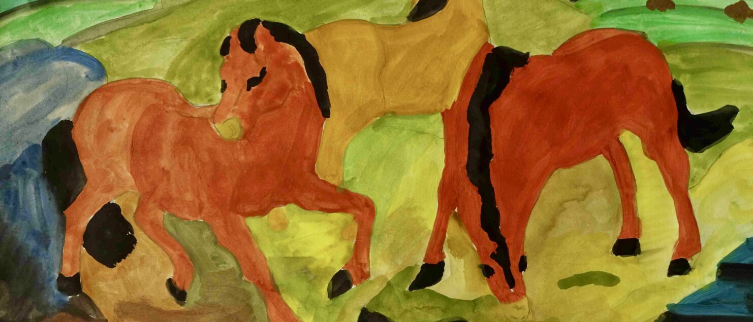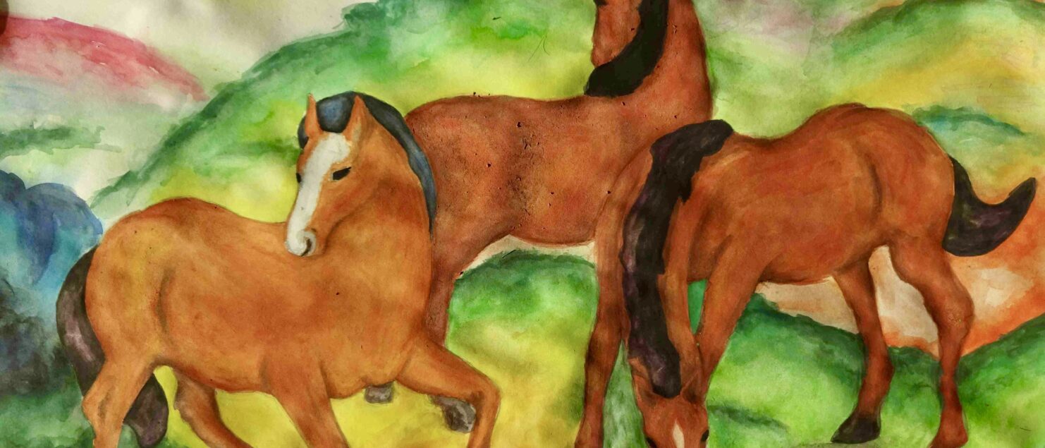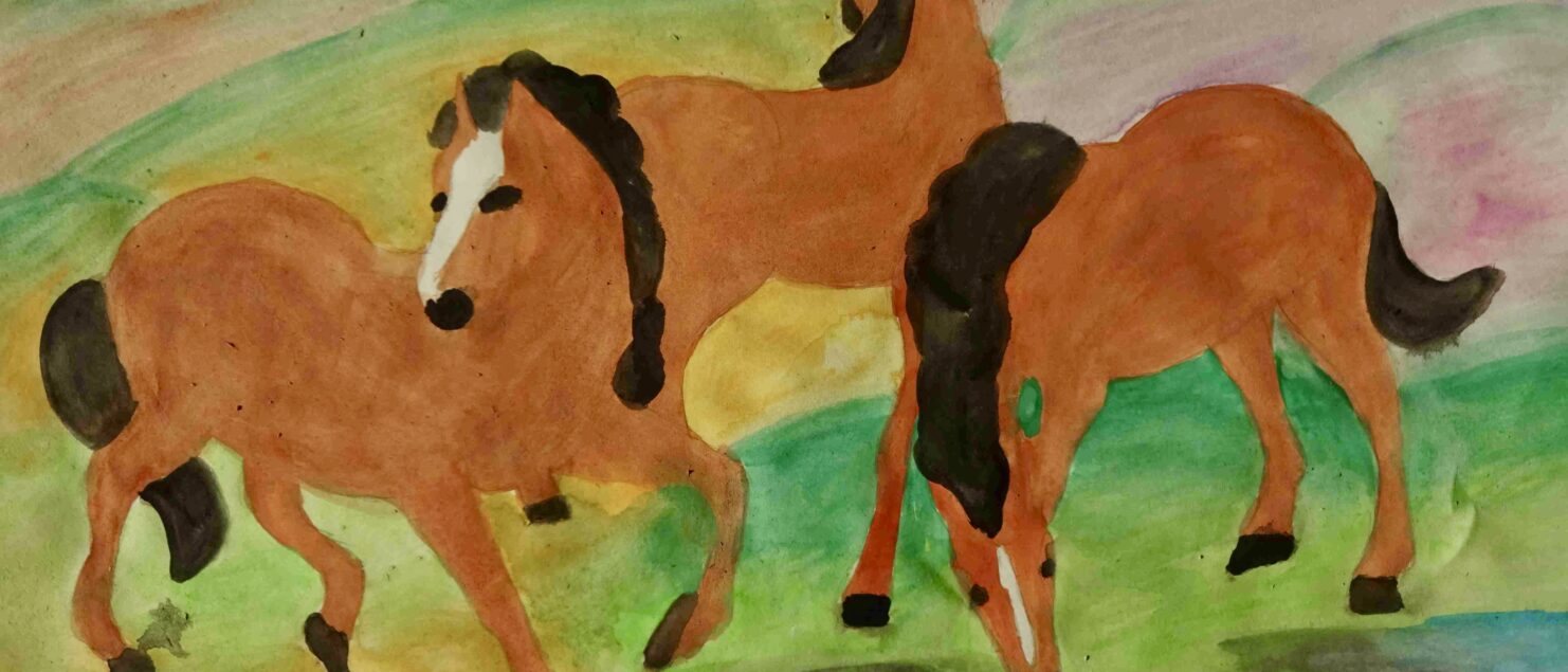 Die Schülerinnen und Schüler malen gerne Tiere, haben aber oft Scheu vor der Darstellung von Pferden, da es ihnen schwerfällt, die Bewegung der Pferde in einem Bild wiederzugeben. Mit Hilfe eines Bildes von Franz Marc, das einem faszinierenden Kompositionsschema folgt, konnte nun „Pferde zeichnen“ geübt werden. Drei Pferde vollführen einen Tanz in diesem Bild. Das erste ist dem Betrachter zugewendet, das mittlere blickt in die Landschaft und das dritte trinkt aus einem Bach im Vordergrund. Somit entsteht eine grandiose Dreieckskomposition. Außerdem besticht Marc immer mit seinen expressiven und leuchtenden Farben.