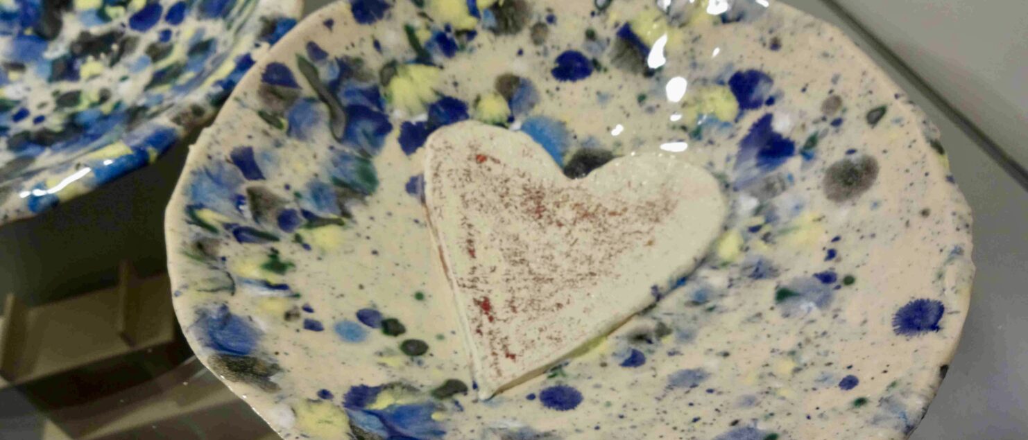 Die 5GR formte im Unterrichtsgegenstand Kunst und Gestaltung mit Hilfe von Gipsmodeln verschiedene Schalen aus weißbrennendem Ton und verzierte sie mit Liebe zum Detail plastisch mit Blumenformen, Herzen oder geometrischen Figuren. Die Ränder wurden mit Schleifpapier vor dem Glasurbrand noch fein bearbeitet. Eine glänzende und blau-grün-gelb gesprenkelte Streichglasur wurde abschließend aufgetragen. Außerdem wurden Christbaumanhänger in Flügelformen und Bäumchen ausgestochen und geformt.