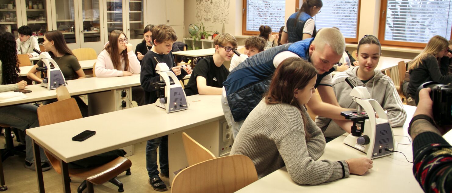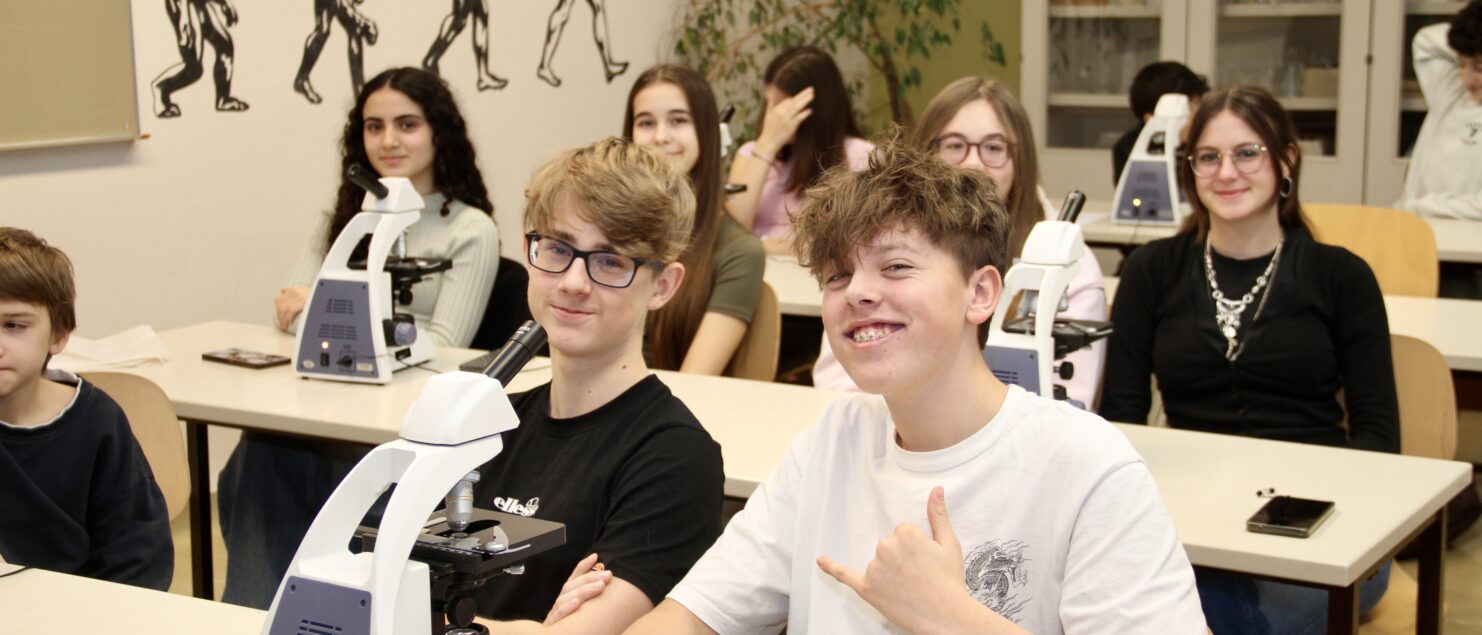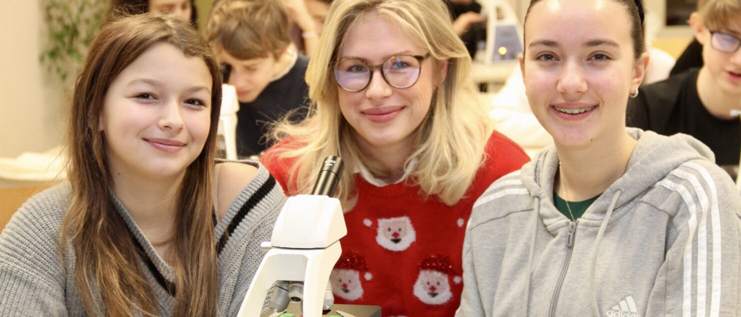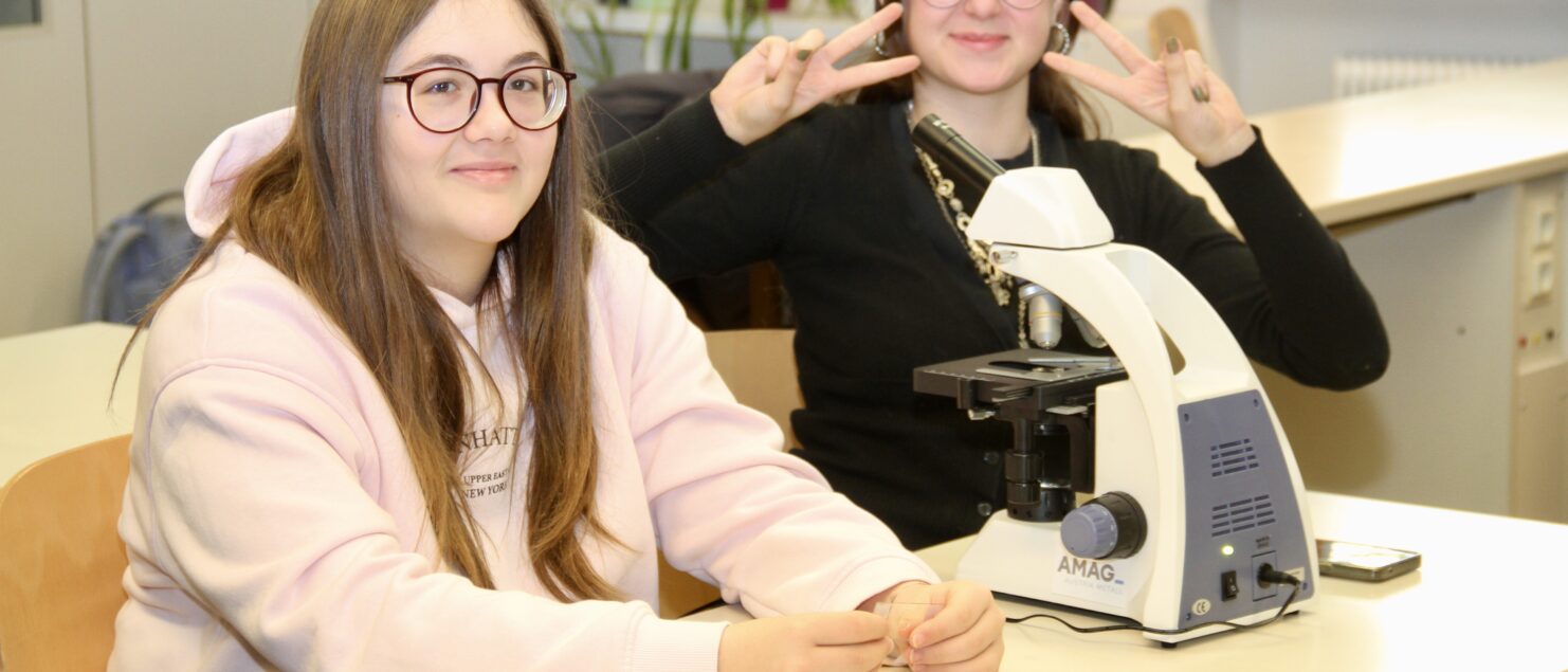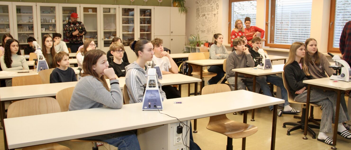 Am 19. Dezember besuchte eine Delegation der AMAG, angeführt von der neuen Leiterin der Abteilung Kommunikation und Marketing, MMag.a Alexandra Hanischläger, MBA, unsere Schule und überreichte im Biologiesaal 15 neue Mikroskope. Die Schülerinnen und Schüler der 4B-Klasse, die gerade Labor-Unterricht bei Mag. Andreas Friese hatten, machten sich auch gleich an die Arbeit …