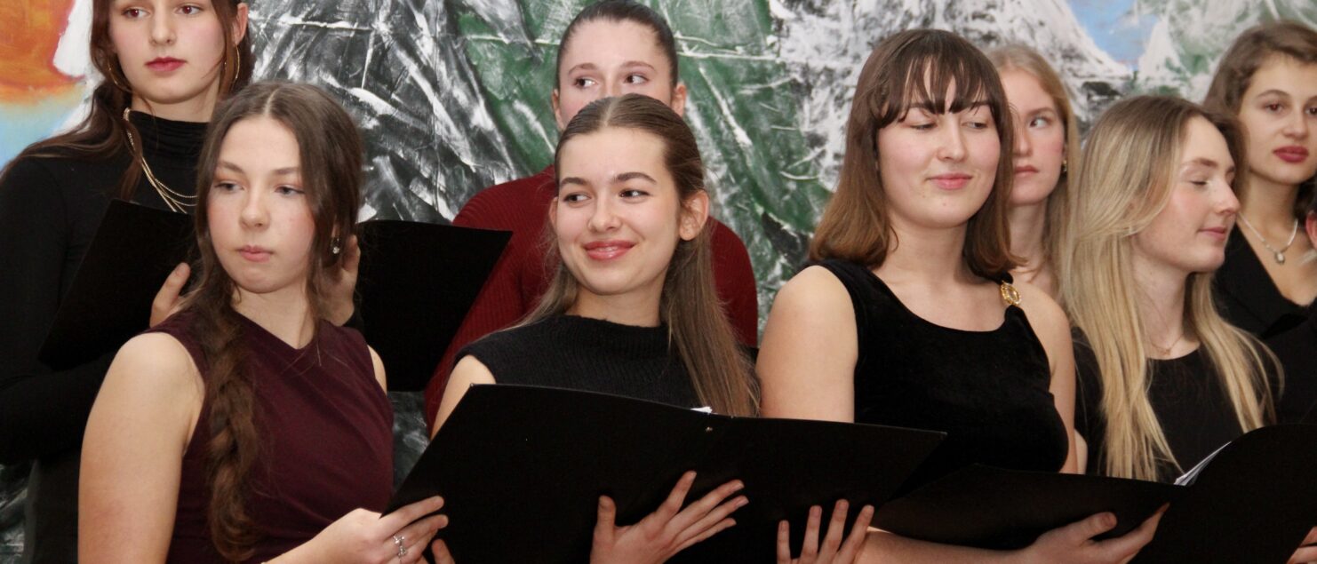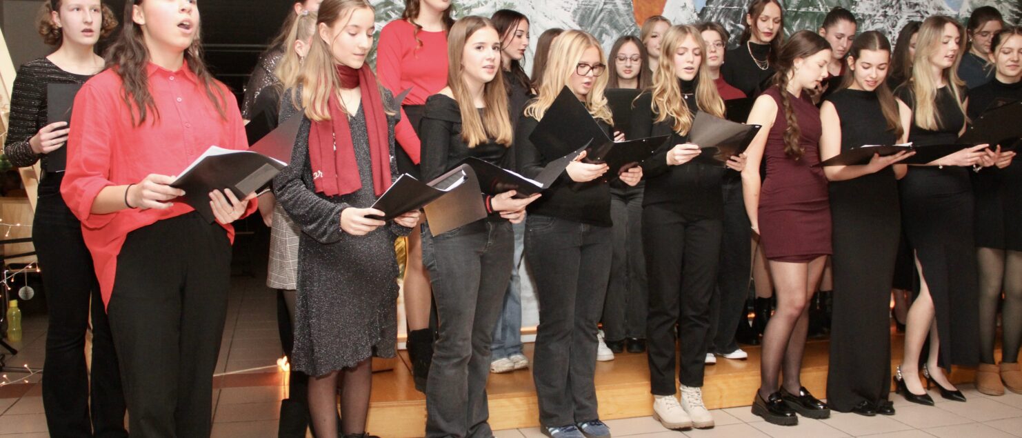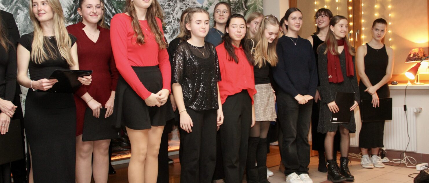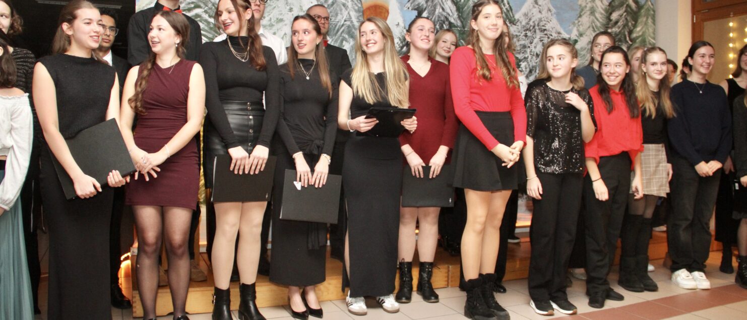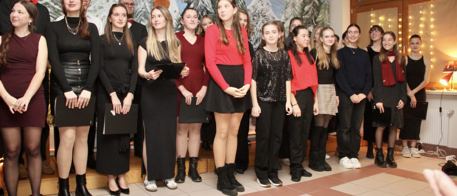 Rund 40 Sängerinnen und Sänger, Instrumentalmusikerinnen und -musiker sowie Tänzerinnen – hauptsächlich aus der 4A-, der 7G-, der 7B- und der 8GR-Klasse, mit Unterstützung durch einzelne Schüler/innen aus der 3A-, der 3C- und der 4B-Klasse – boten beim „Winterkonzert“ am 17. Dezember eineinhalb Stunden lang gekonnte und berührende Darbietungen und bereiteten damit den rund 120 Zuhörerinnen und Zuhörern – und wohl auch sich selbst – ein besonderes musikalisches Weihnachtsgeschenk.