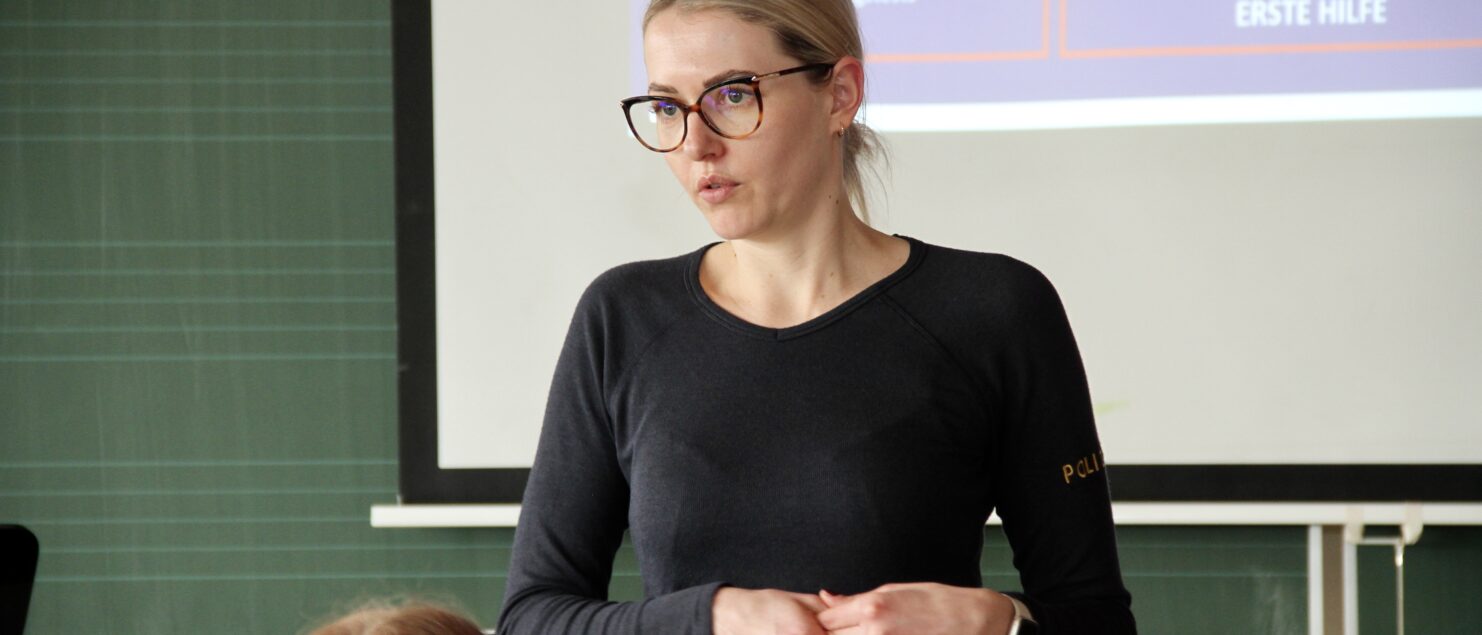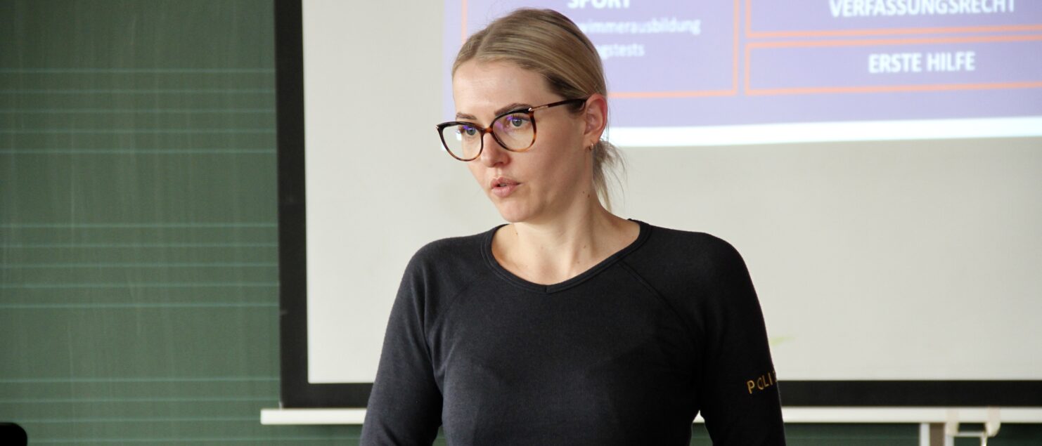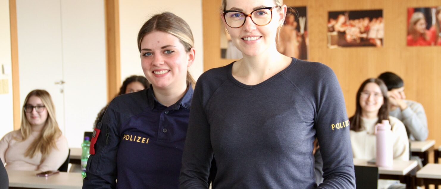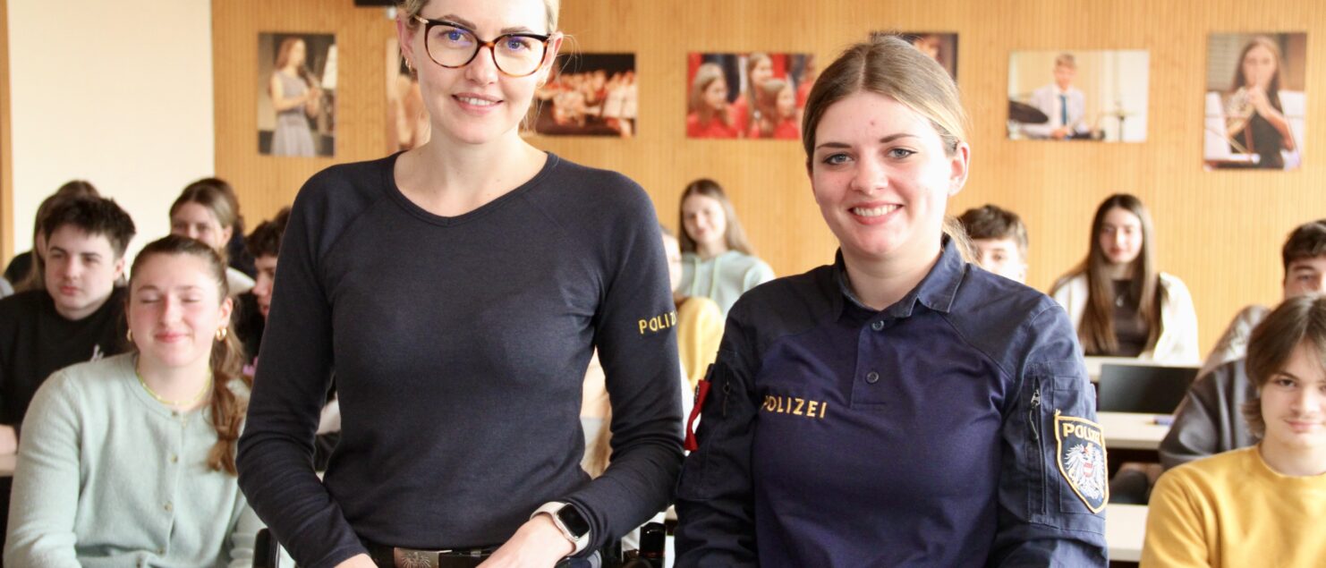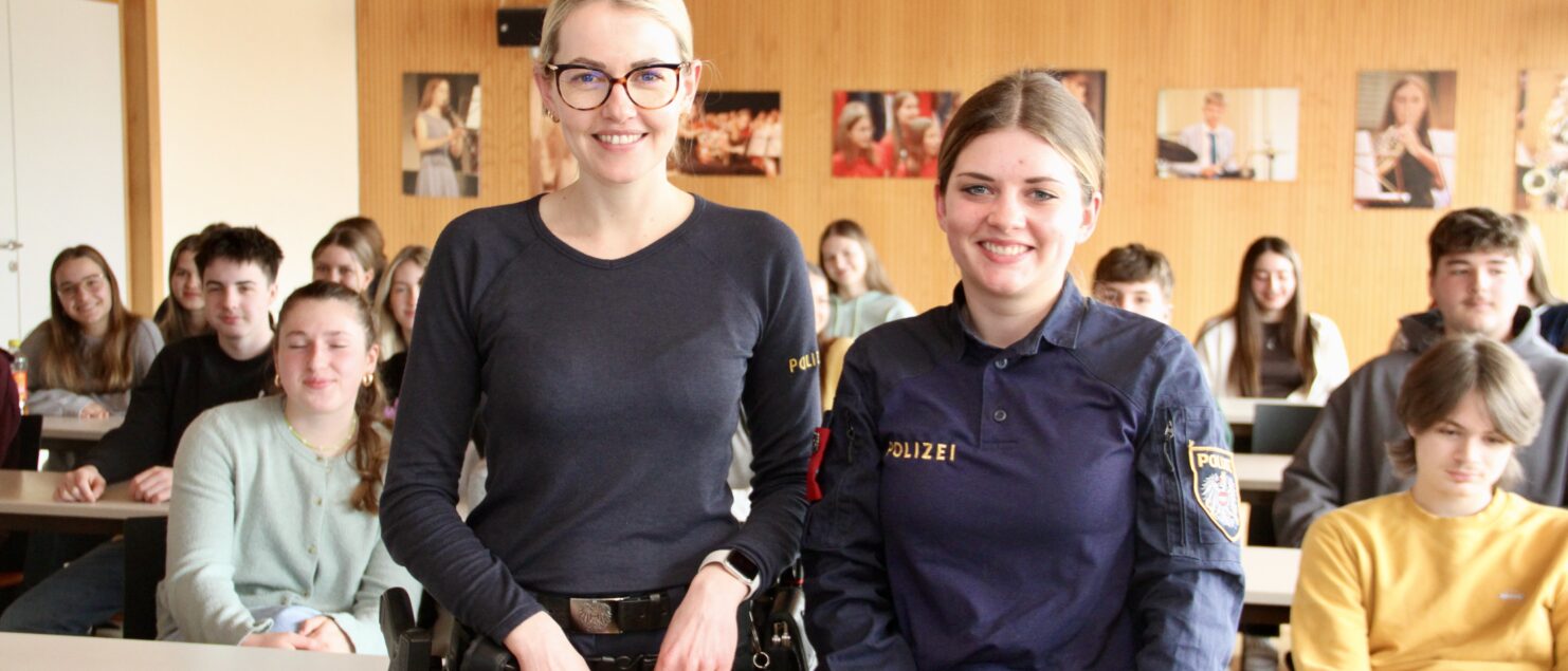 Bezirksrecruiterin Inspektorin Susanne Ecker, assistiert von Sophie Mair, informierte anhand einer interessanten Präsentation über die Ausbildung, das Berufsbild und die Einsatzgebiete bei der Polizei. Im Anschluss wurden die aufgekommenen Fragen der Schülerinnen und Schüler ausführlich beantwortet.