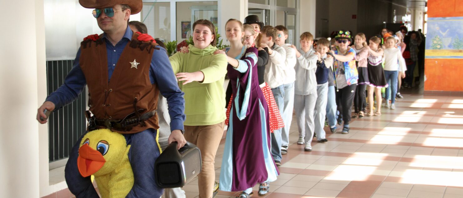 Ein weiteres Highlight war auch diesmal die Polonaise in der großen Pause, angestiftet und angeführt von Mag. Matthias Kritzinger. Der Faschingsumzug durchs ganze Schulgebäude mündete wieder in eine Massen-Macarena vor dem Konferenzzimmer …