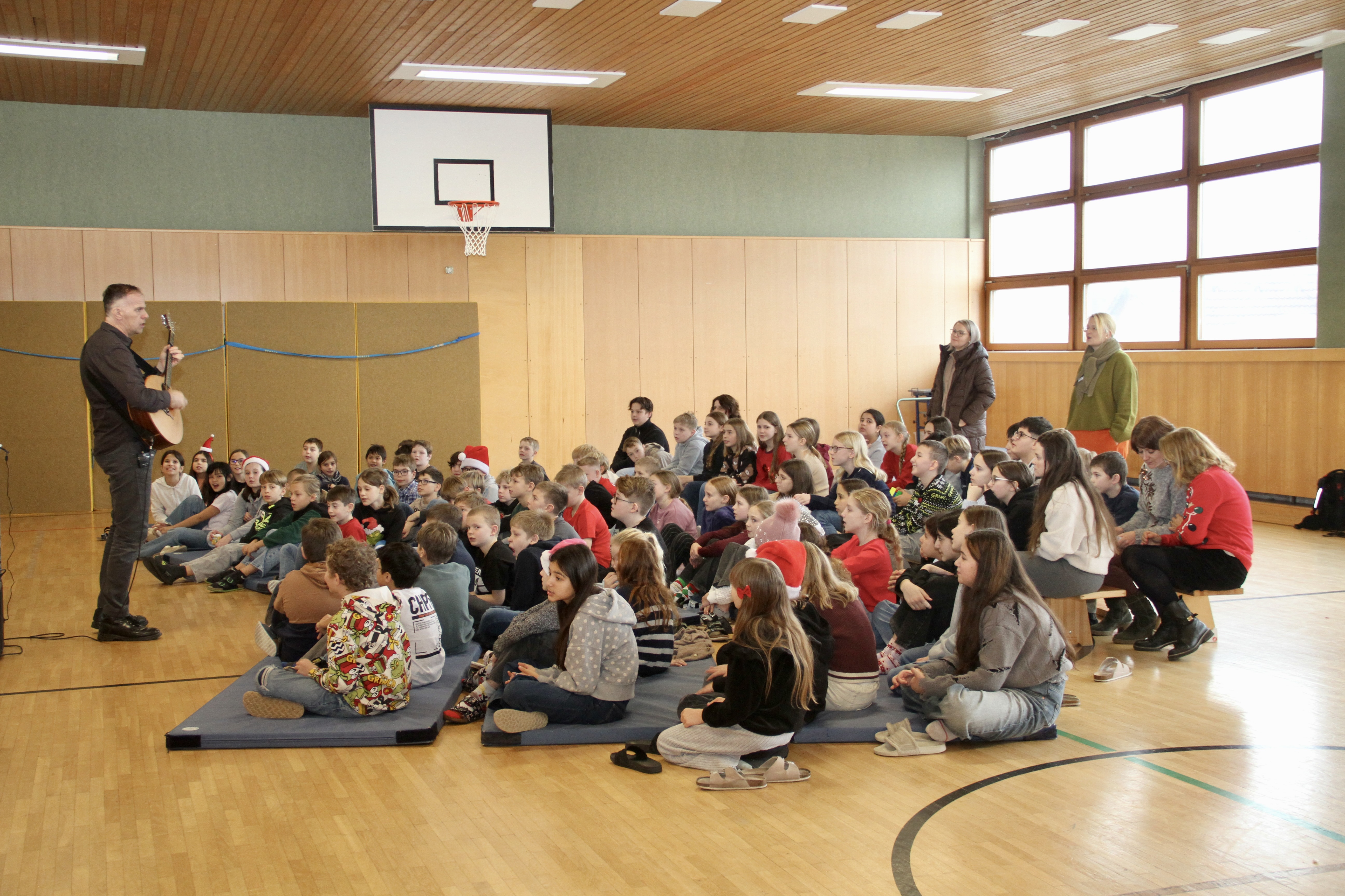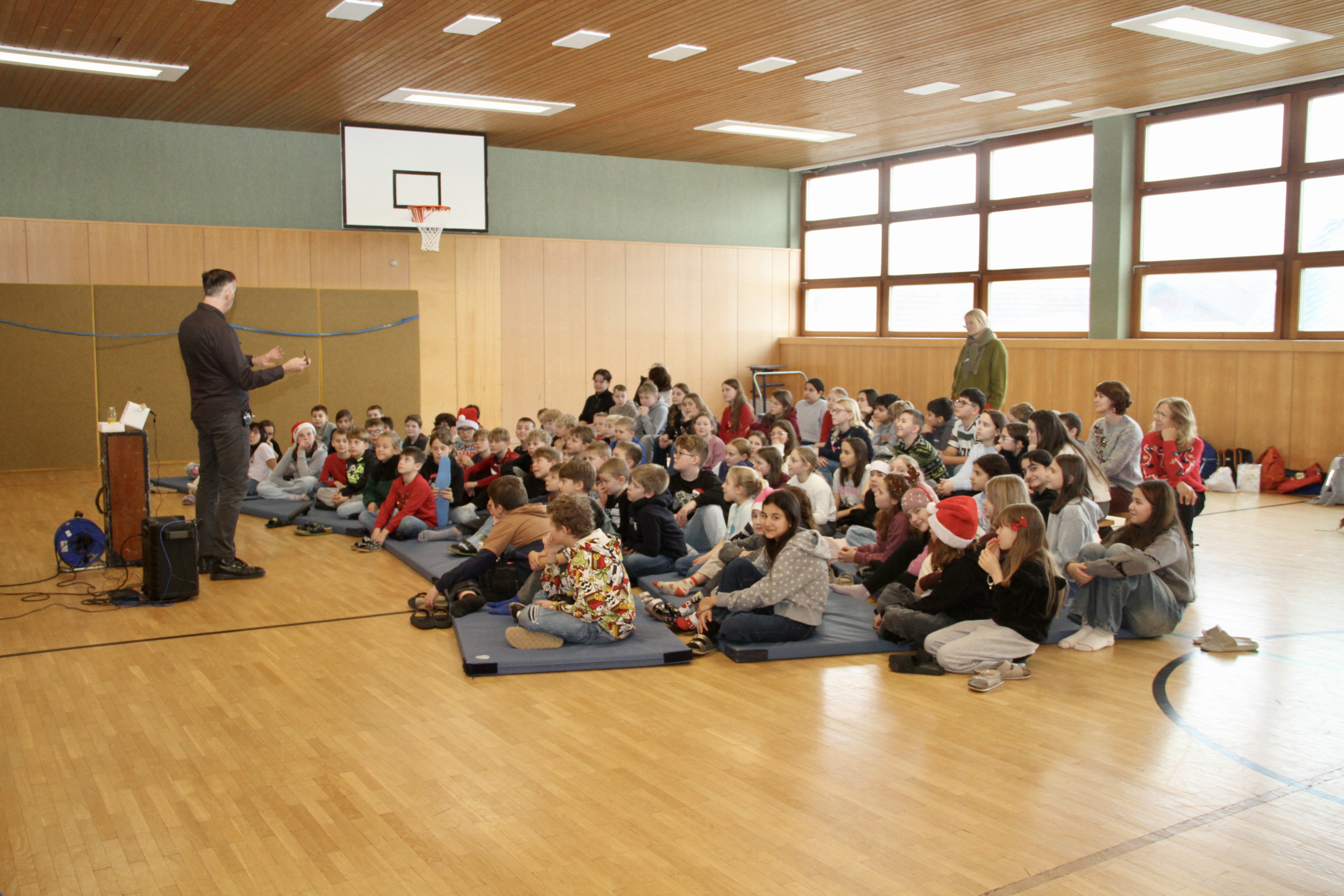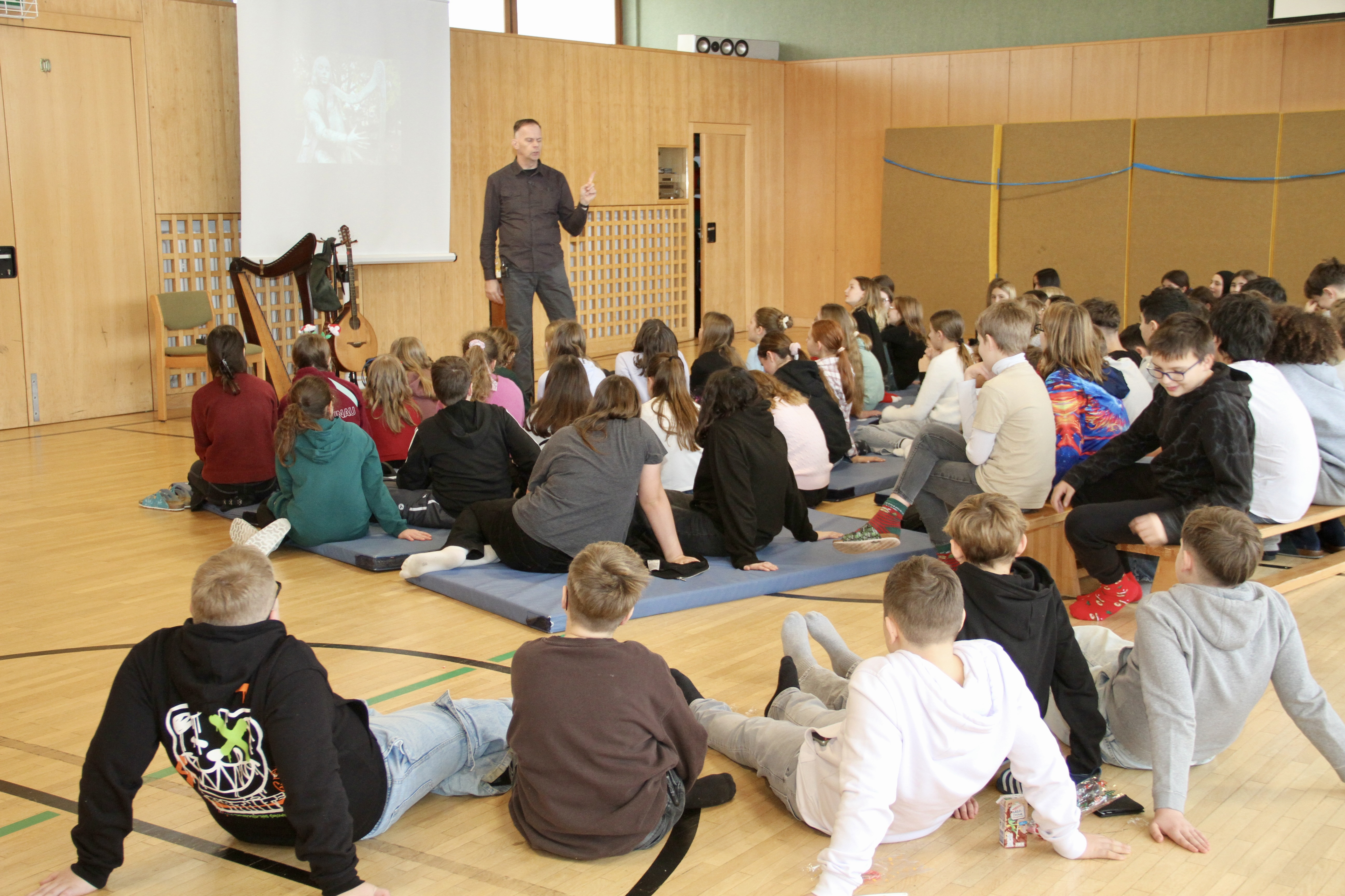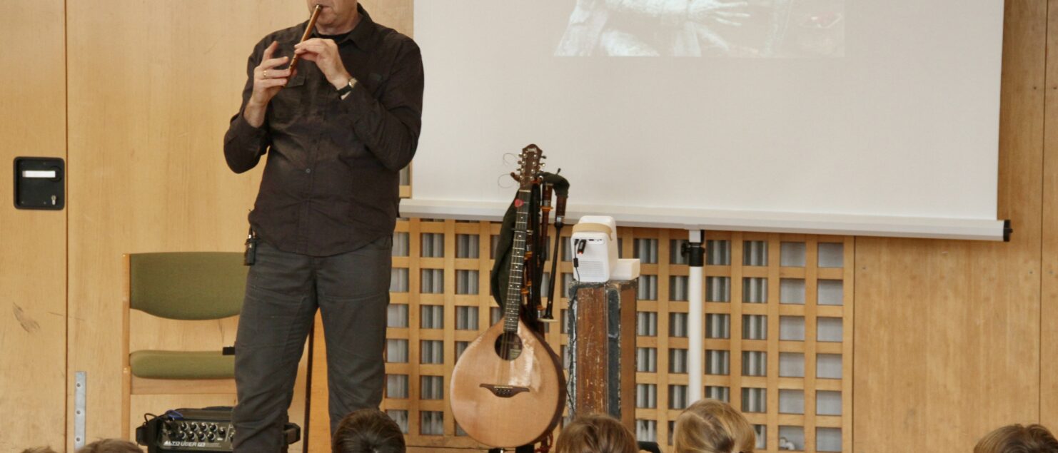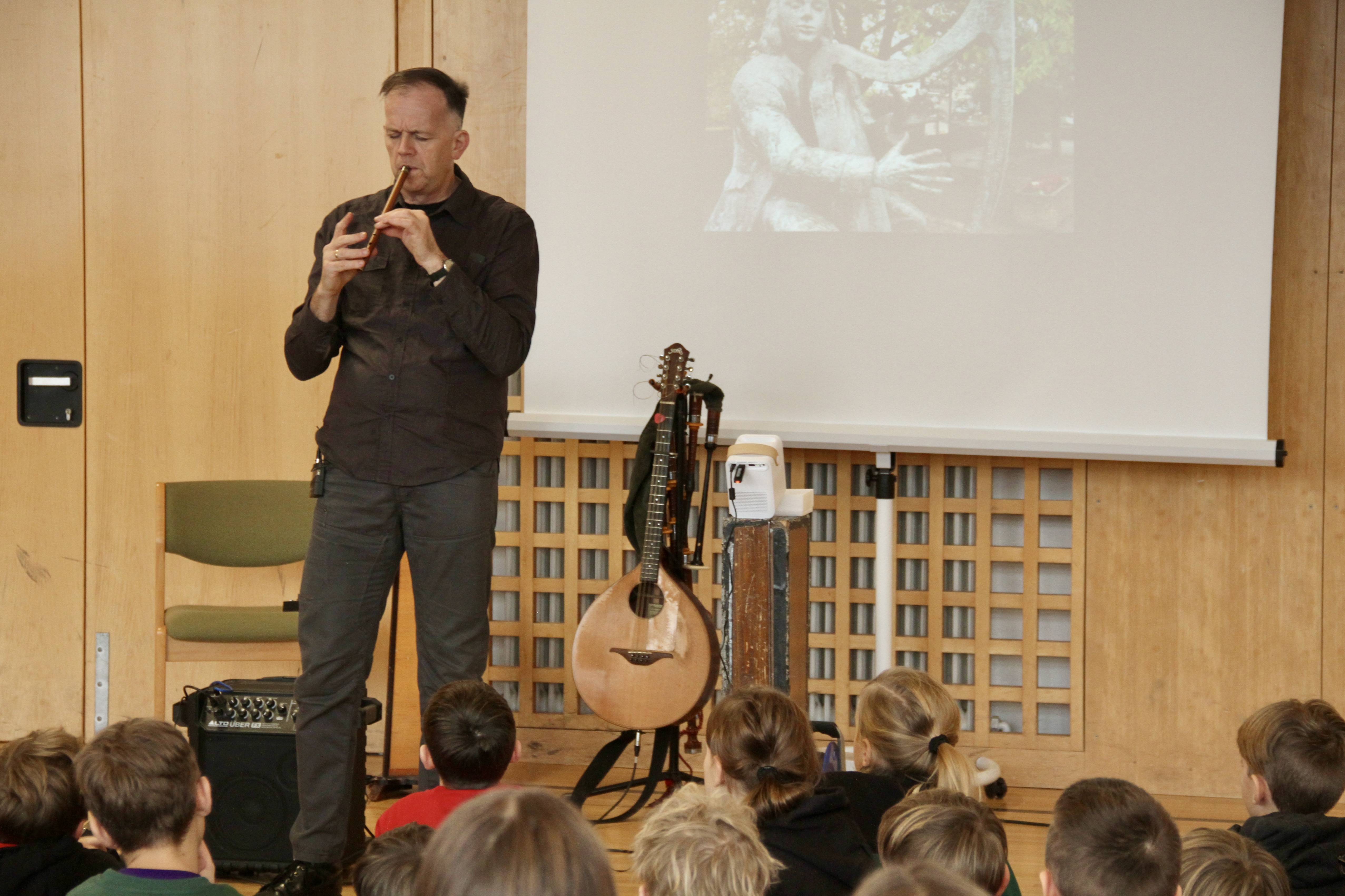 Die Schülerinnen und Schüler, die mit sichtlicher und spürbarer Freude dabei waren, bekamen irische und schottische Weihnachtslieder und weihnachtliche Musik zu hören. Tom Hake spielte Harfe, Dudelsack und irische Bouzouki – und eine Flöte, die er als Junge zu Weihnachten geschenkt bekommen hatte und die der Auslöser dafür war, dass er Musiker wurde. Darüber hinaus erzählte er von weihnachtlichen Bräuchen und Traditionen im ehemals keltischen Kulturbereich.