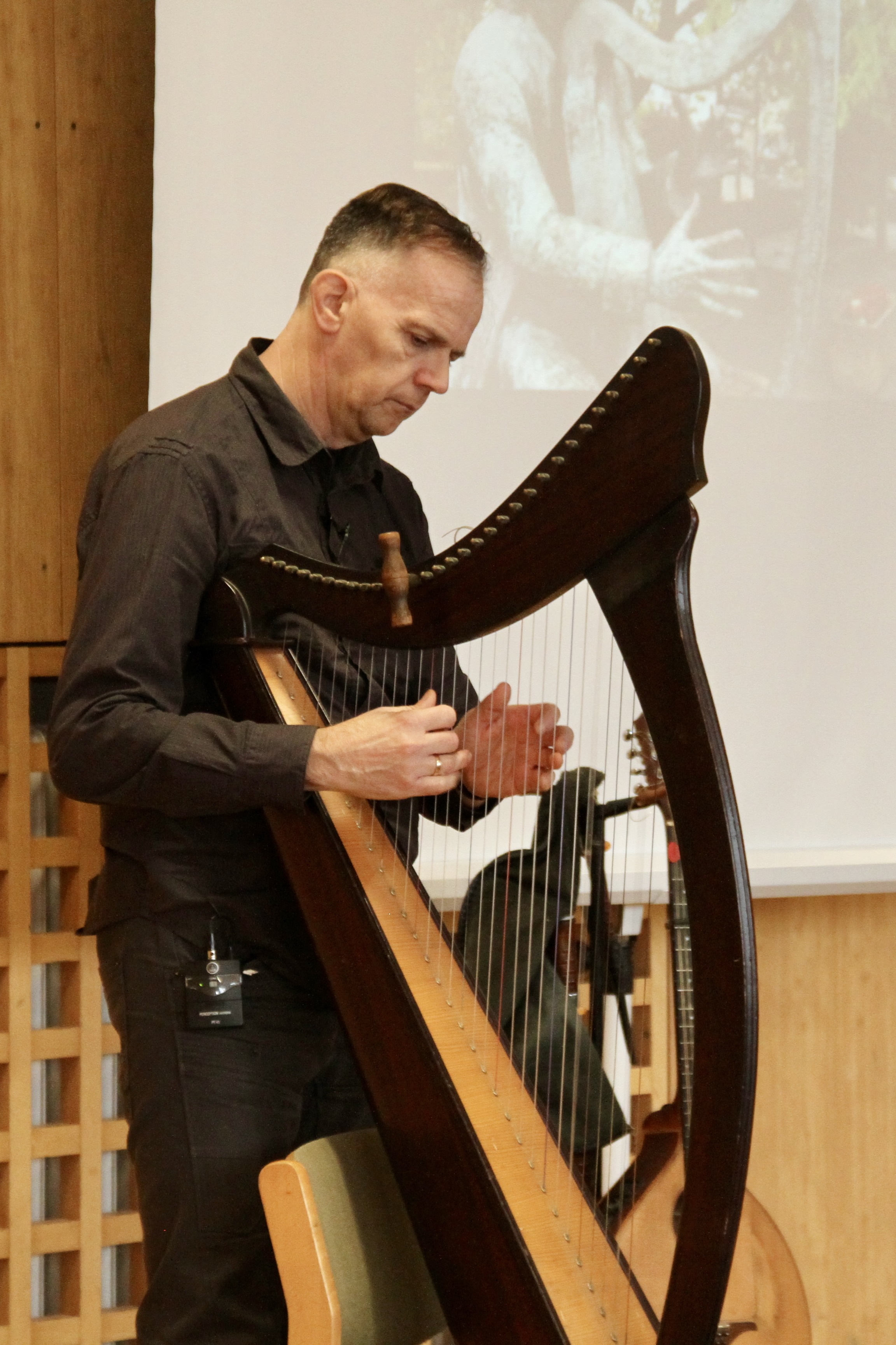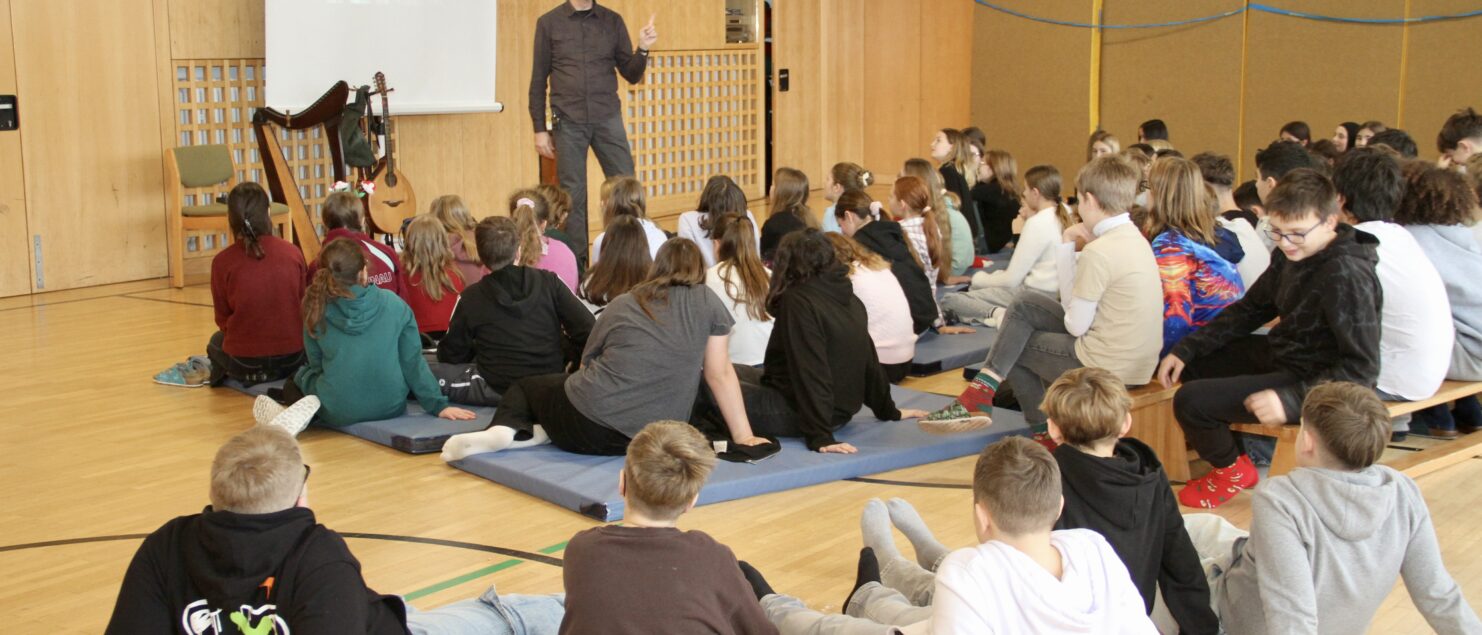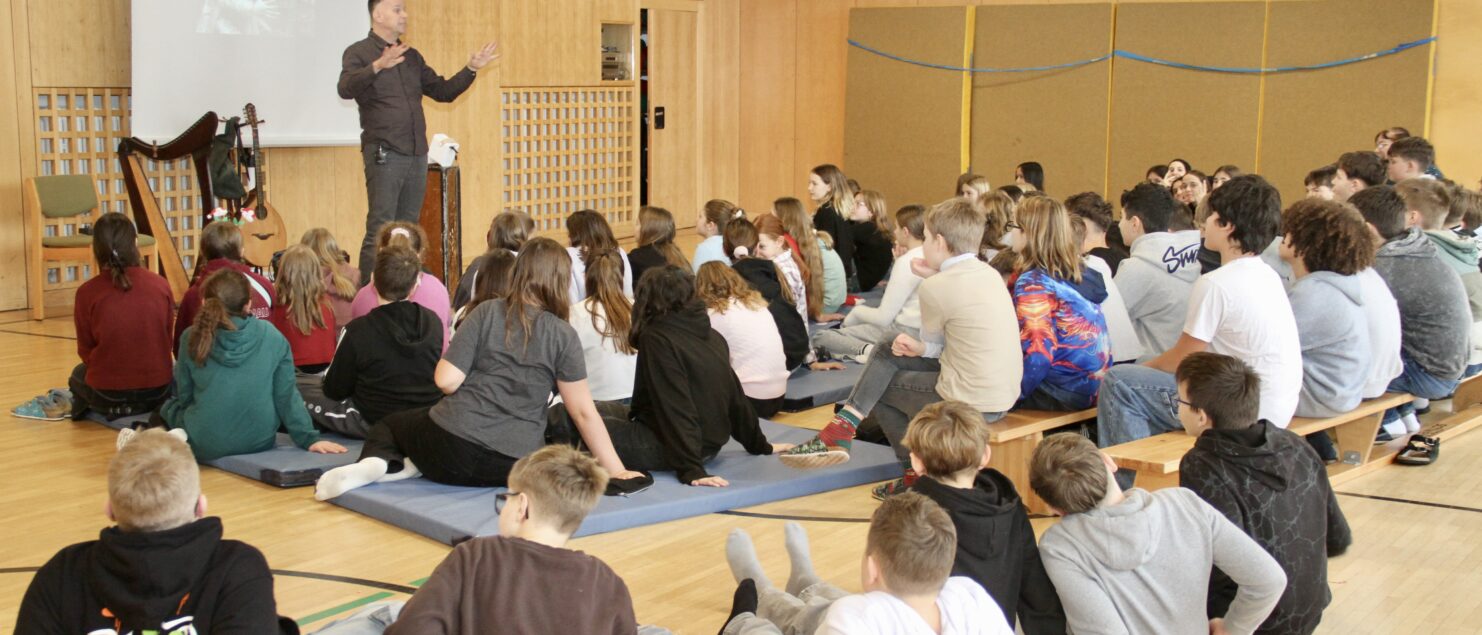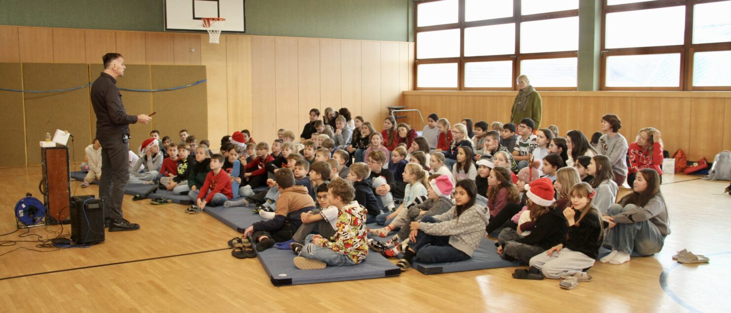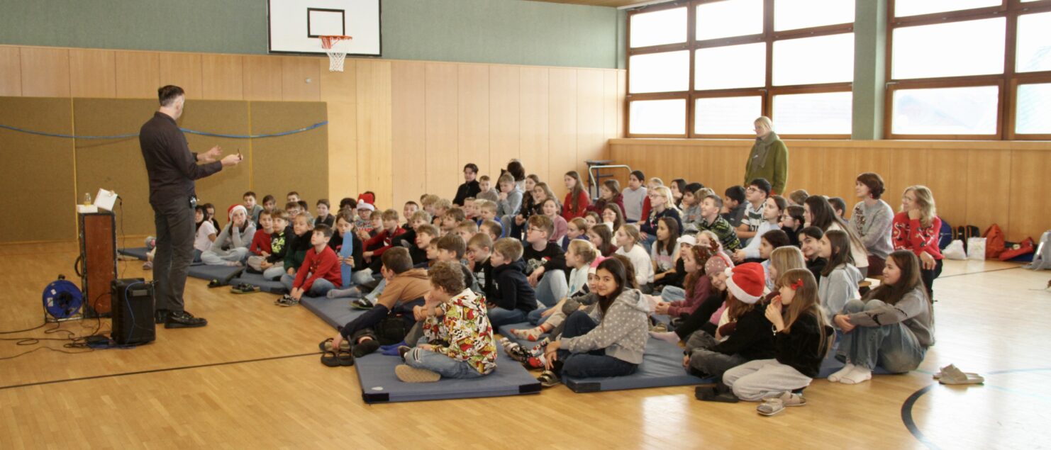Die Schülerinnen und Schüler, die mit sichtlicher und spürbarer Freude dabei waren, bekamen irische und schottische Weihnachtslieder und weihnachtliche Musik zu hören. Tom Hake spielte Harfe, Dudelsack und irische Bouzouki – und eine Flöte, die er als Junge zu Weihnachten geschenkt bekommen hatte und die der Auslöser dafür war, dass er Musiker wurde. Darüber hinaus erzählte er von weihnachtlichen Bräuchen und Traditionen im ehemals keltischen Kulturbereich.