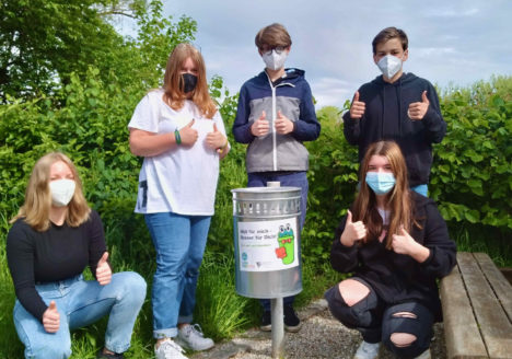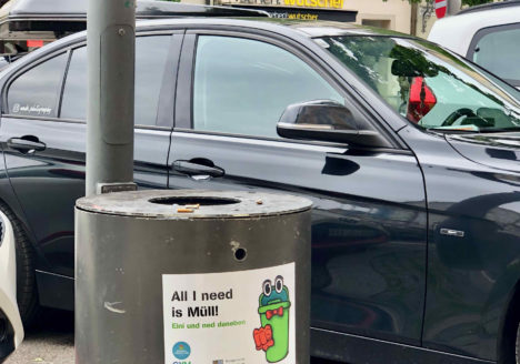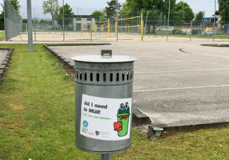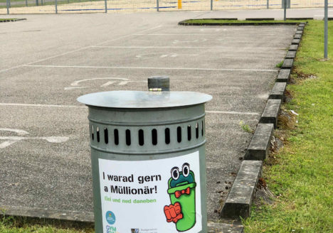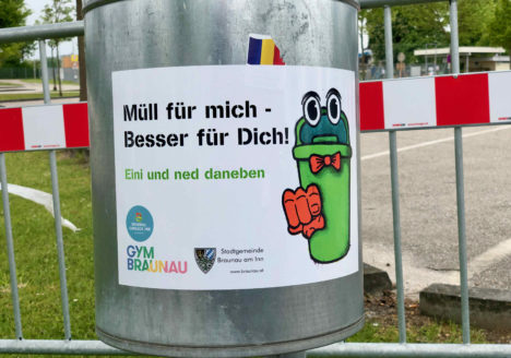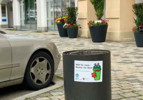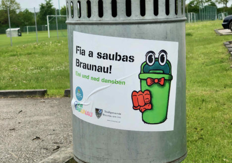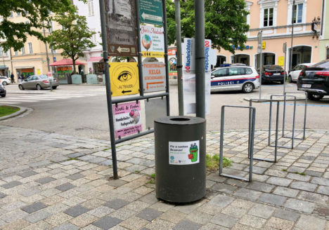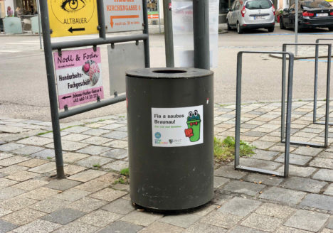Mülleimer in Braunau wurden mit originellen Stickern versehen.
